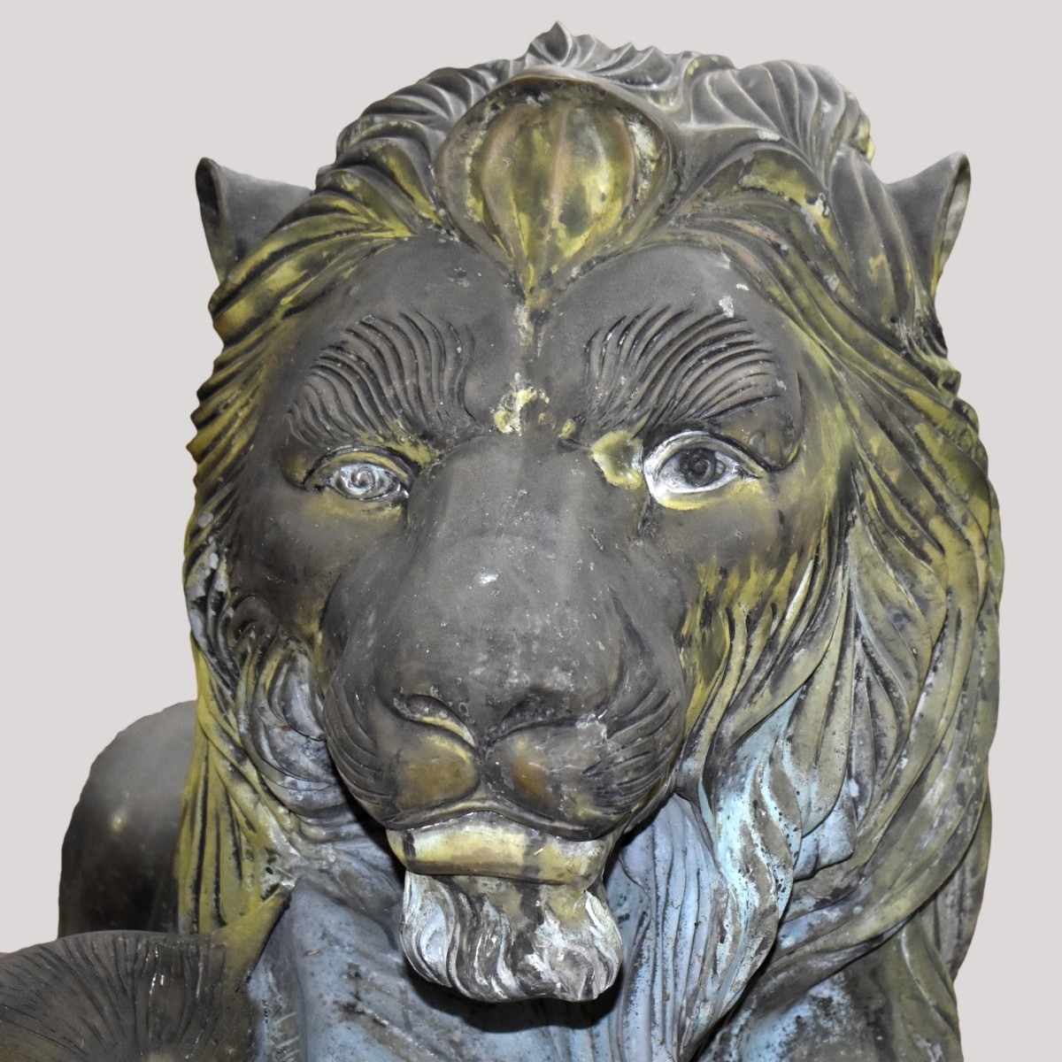 After: Auguste Moreau, French (1834 - 1917) Pair of Palace Size Lion with Cub Garden or Entry Bronze Sculptures. Signed. Measures 28" x 48" x 21". Condition: Green patina, oxidation and soiling to the surface. Estimate: $1000.00 - $3000.00 Domestic Shipping: Third party