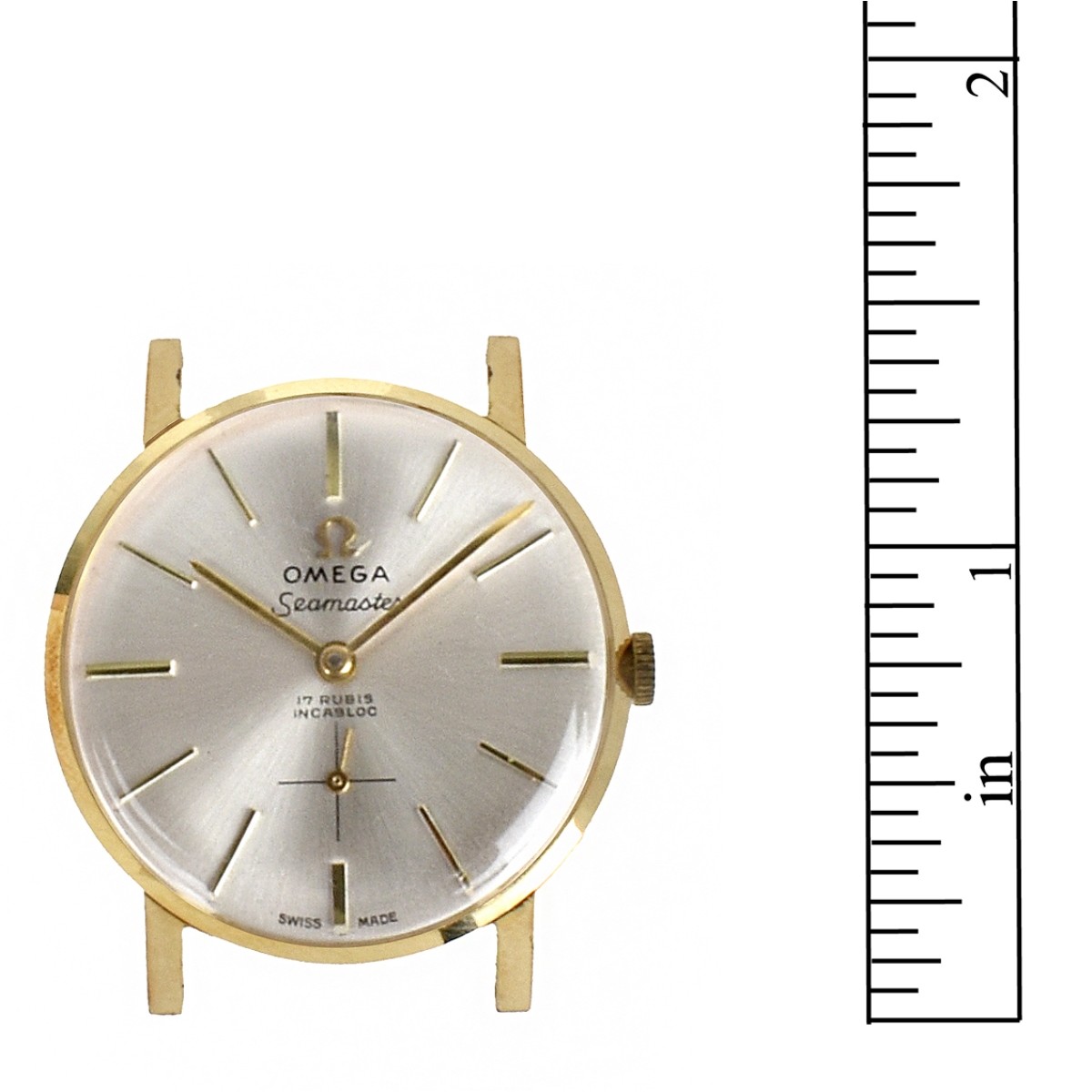 Man's Vintage Omega Seamaster 18 Karat Yellow Gold Watch. White dial, manual wind movement. Case measures 33mm. Case back stamped 18K. Approx. gross weight: 19.16 grams. Condition: Very good pre-owned condition. Running. Please note the gallery does not warranty the running condition of watches. Estimate: $300.00 - $500.00 Domestic Shipping: $40.00