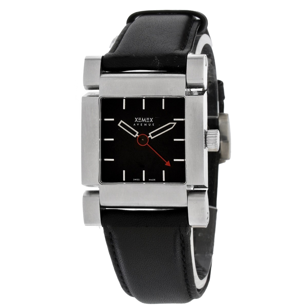 Vintage Xemex, Ruedi Kulling, Avenue Stainless Steel Watch, Black Dial, Leather Strap. Automatic self-winding movement. Case measures 34.5 x 31mm. Strap measures 9-1/2" L. No box or papers. Condition: Very good pre-owned condition. Slight surface wear. Running. Please note the gallery does not warranty thew running condition of watches. Estimate: $100.00 - $300.00 Domestic Shipping: $40.00