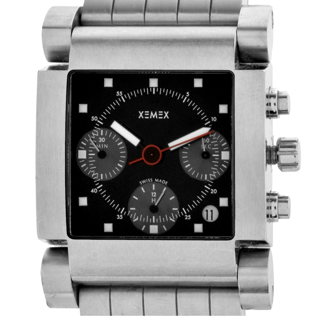 Vintage Xemex, Ruedi Kulling, Avenue Stainless Steel Chronograph Bracelet Watch, Black Dial. Automatic self-winding movement. Case measures 37 x 33mm. Bracelet measures 7" interior circumference . No box or papers. Condition: Good pre-owned condition. Light surface wear and scratches from normal use. Running. Please note the gallery does not warranty the running condition of watches. Estimate: $300.00 - $500.00 Domestic Shipping: $40.00