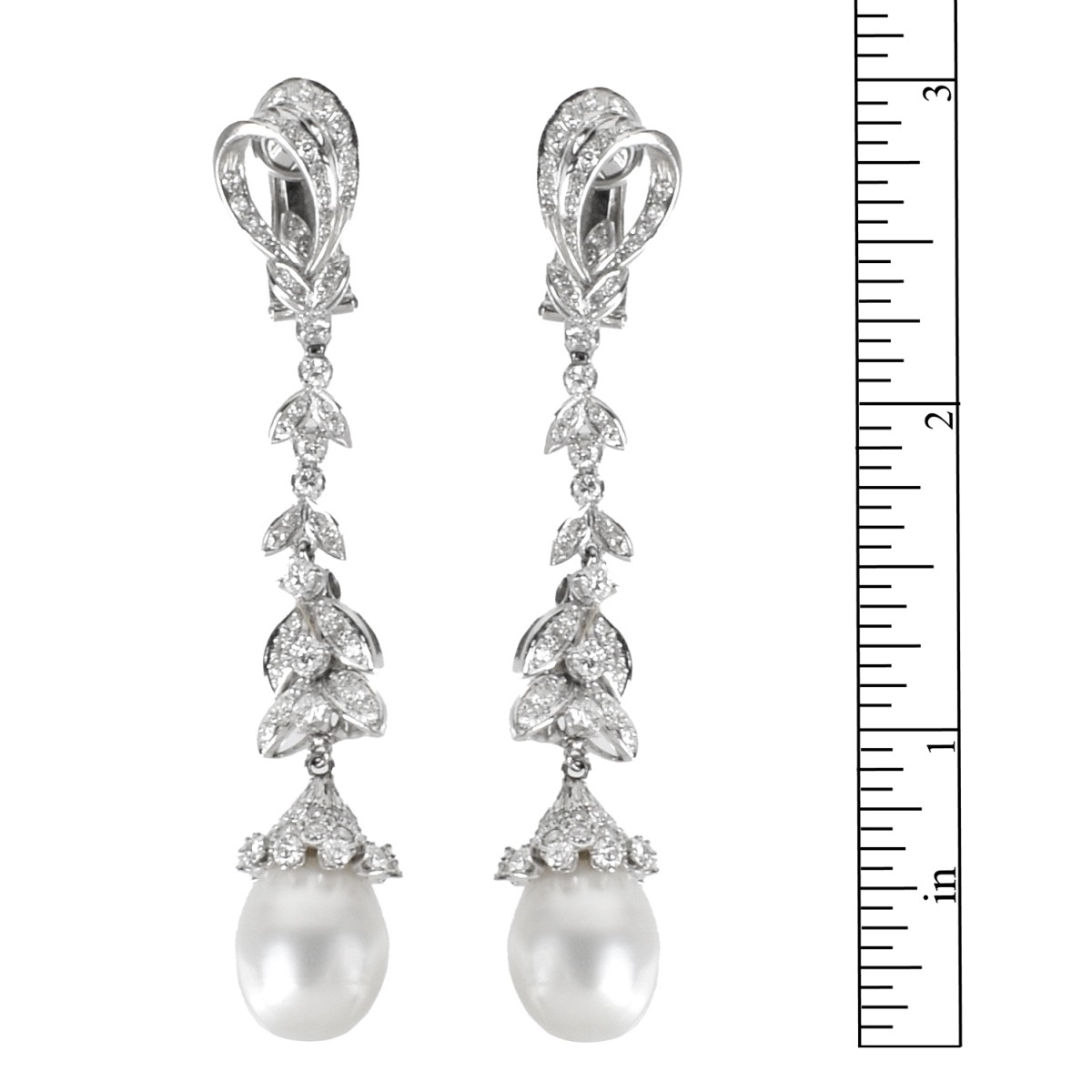 Very Fine South Sea Pearl, Approx. 7.75 Carat TW Round Brilliant Cut Diamond and Platinum Drop Earrings. Pearls with good luster and polish, measure 12.5mm. Diamonds F-G color, VS1-SI1 clarity. Earrings measure 3" L. Approx. weight: 28.9 grams. Condition: Very good condition. For additional information and/or WhatsApp video please contact our resident GIA Graduate Gemologist, Russ Kodner at 954.650.5030 Estimate: $7000.00 - $9000.00 Domestic Shipping: $40.00