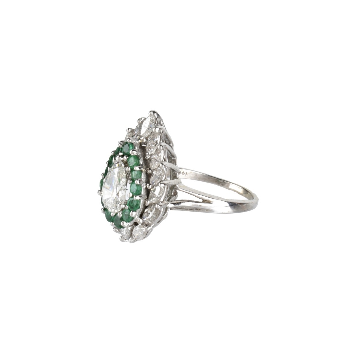 Approx. 4.25 Carat TW Diamond, Emerald and 14 Karat White Gold Ring. Set in the center with an approx. 1.30 carat pear shape diamond, I color, SI2 clarity. Accented throughout with approx. 2.95 carat TW marquise cut diamonds and round cut emeralds. Accent diamonds G-H color, VS clarity. Stamped 14K. Ring size 8. Approx. weight: 8.0 grams. Condition: Very good condition. For additional information and/or WhatsApp video please contact our resident GIA Graduate Gemologist, Russ Kodner at 954.650.5030 Estimate: $6000.00 - $8000.00 Domestic Shipping: $40.00