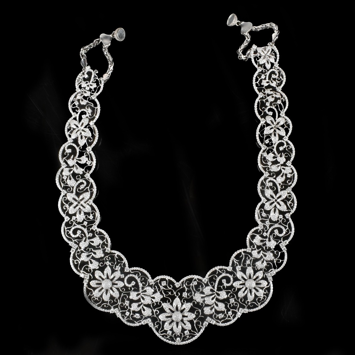 Approx. 35.0 Carat TW Round Brilliant Cut Diamond and 18 Karat White Gold Necklace. Diamonds F-G color, VVS-VS clarity. Measures 18" L, 2" W. Approx. weight: 137.8 grams. Condition: Very good condition. For additional information and/or WhatsApp video please contact our resident GIA Graduate Gemologist, Russ Kodner at 954.650.5030 Estimate: $30,000.00 - $40,000.00 Domestic Shipping: $44.00