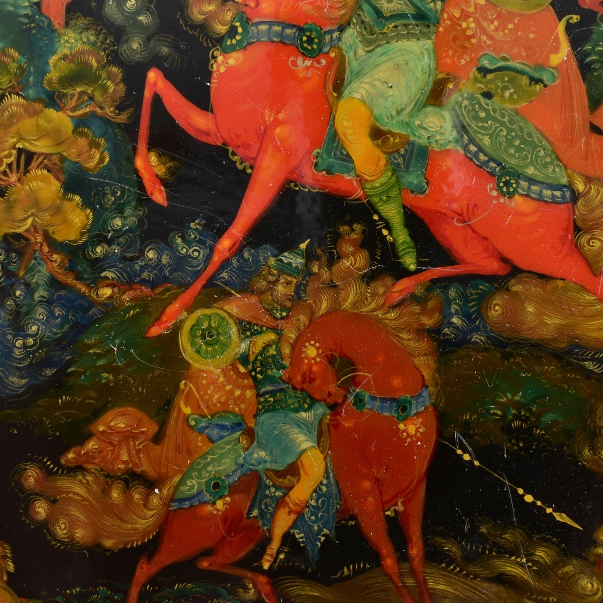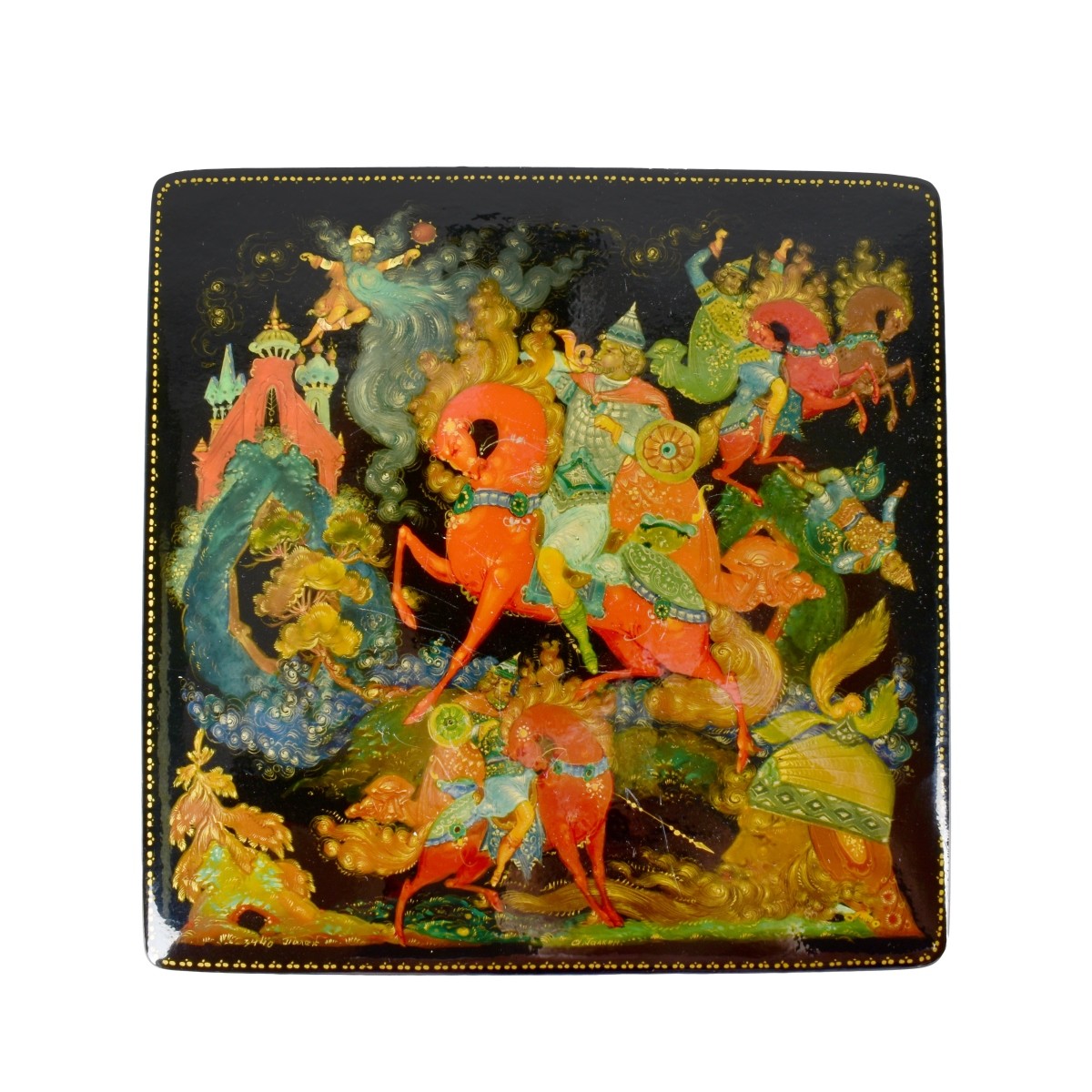 Grouping of Two Vintage Russian Lacquer Boxes with Mythical Figural Scenes. Each signed and inscribed on the top. Each marked made in USSR on the base. Largest measures 1-3/4" x 4-7/8" x 4-7/8". Smallest measures 1-3/4" x 4-7/8" x 4". Condition: Each are in good condition. Estimate: $50.00 - $150.00 Domestic Shipping: $55.00