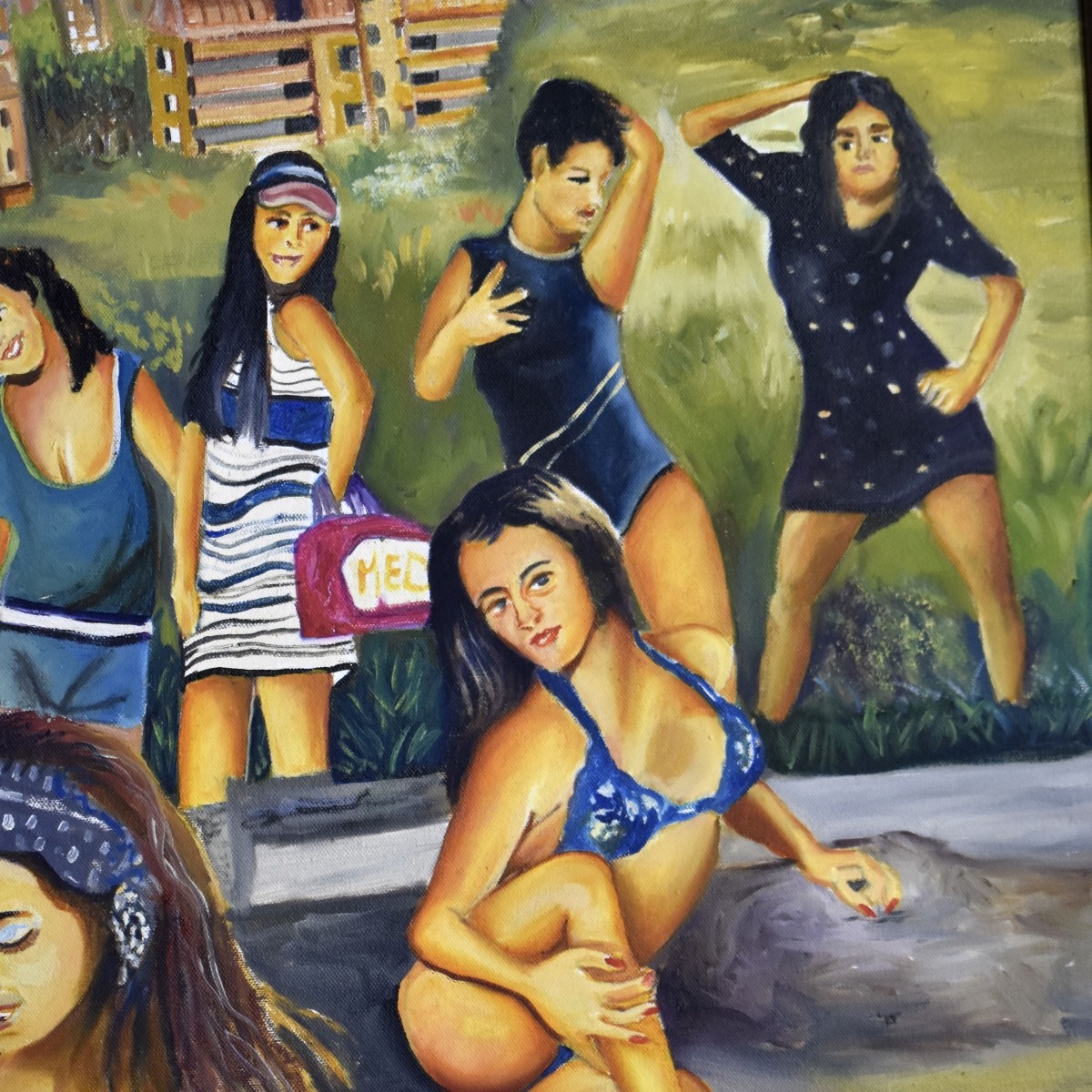 Gustavo Gomez Oil on Canvas. Girls Posing. Signed lower left. Measures 25" H x 54" W Frame 44" H x 63" W Condition: Good Condition Estimate: $400.00 - $600.00 Domestic Shipping: Third Party