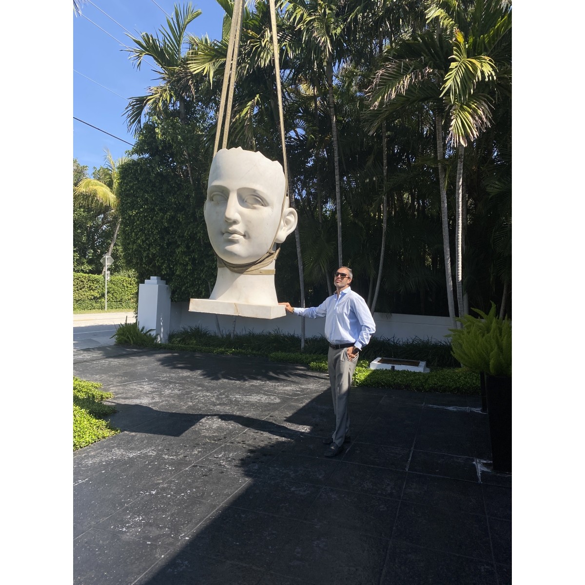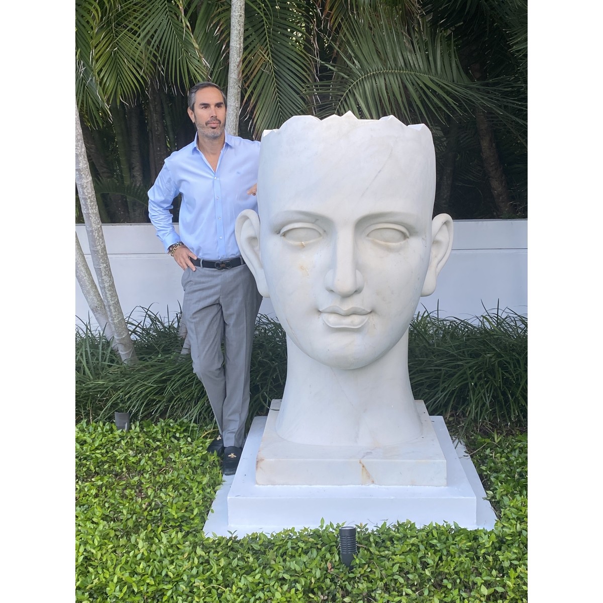 Enrico Mancini, Italian (20th Century) Monumental Neoclassical Marble Garden Sculpture "Male Study" Signed Mancini on Reverse Side. Measures 62" x 41". Provenance: Gasiunasen Gallery. West Palm Beach, FL. Condition: Stress cracks and soiling to the surface, surface wear to a designated area en verso, repairs and fill ins otherwise good condition. Estimate: $18,000.00 - $25,000.00 Domestic Shipping: Thitd party