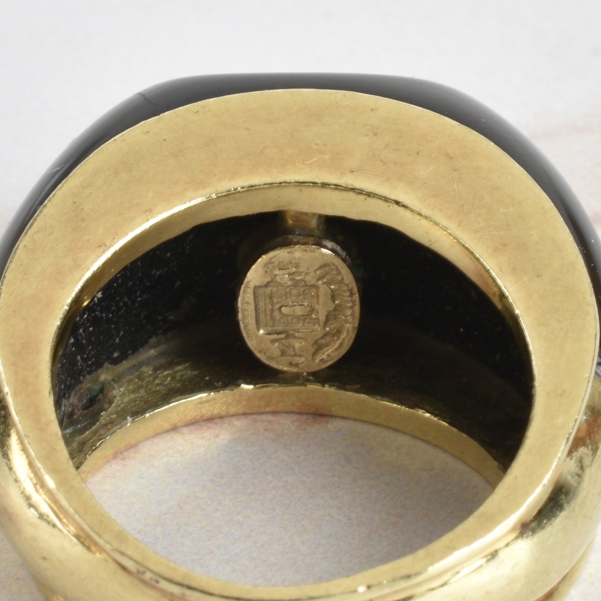 Vintage La Tiomphe Approx. .20 Carat Round Brilliant Cut Diamond, Black Onyx and 14 Karat Yellow Gold Ring. Diamond G-H color, VS clarity. Stamped 14K. Ring size 5. Approx. weight: 11.07 grams. Condition: Good vintage condition. Light surface wear. For additional information and/or WhatsApp video please contact our resident GIA Graduate Gemologist, Russ Kodner at 954.650.5030 Estimate: $400.00 - $600.00 Domestic Shipping: $40.00