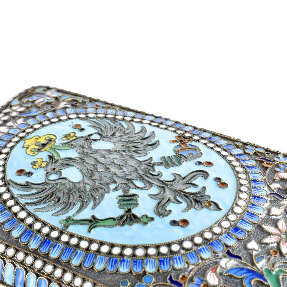 Russian Cloisonne Enamel Silver Cigarette Case. Polychrome enamel with Russian imperial eagle motif and floral design. White enamel bead borders. Hinged case with gilt interior. Unsigned. Measures 4" H, 2-5/8" W. Approx weight: 210.77. Provenance: Purchased circa 2002 at Gallery 24 Antiques, New York, NY. Condition: Very good condition. Estimate: $1000.00 - $1500.00 Domestic Shipping: $42.00