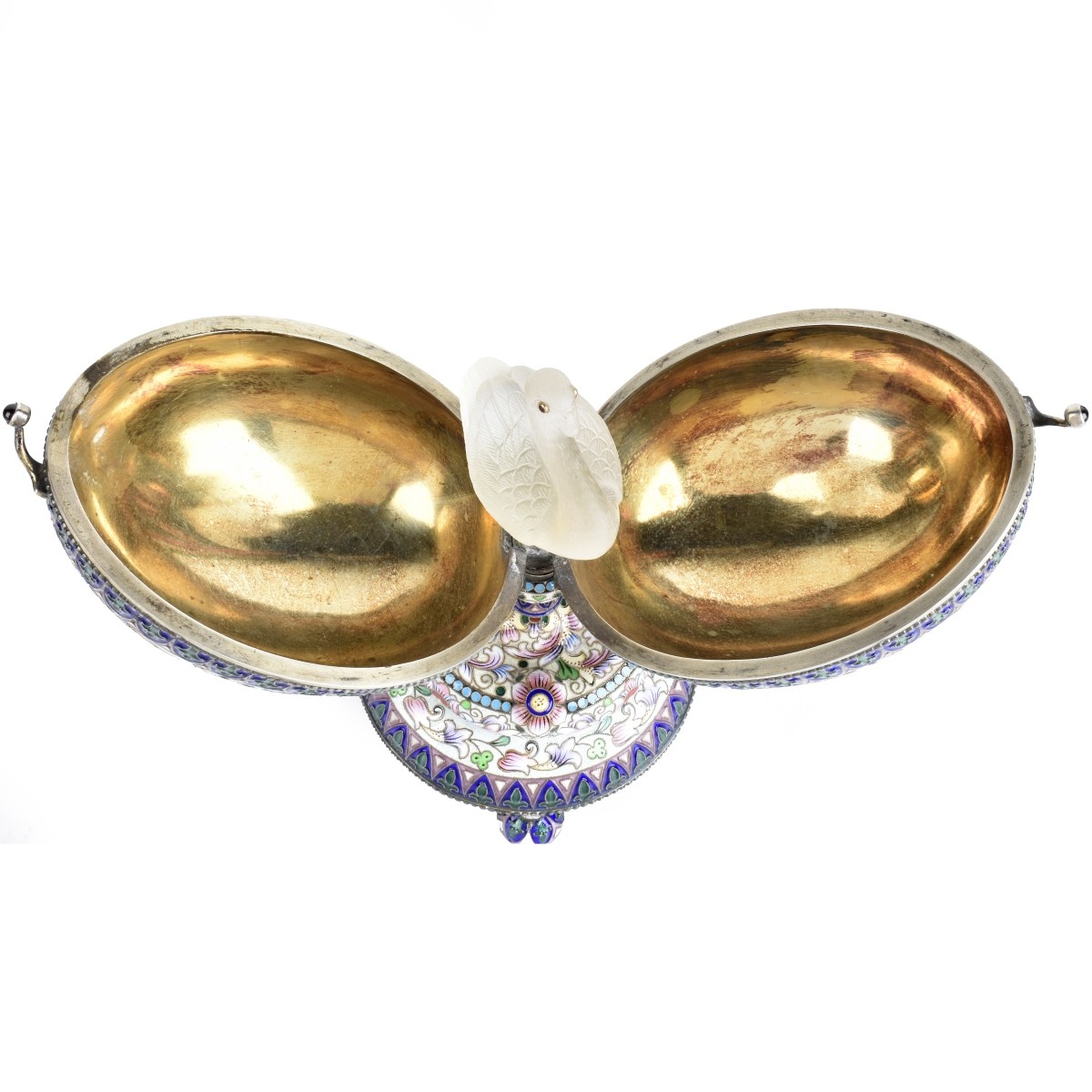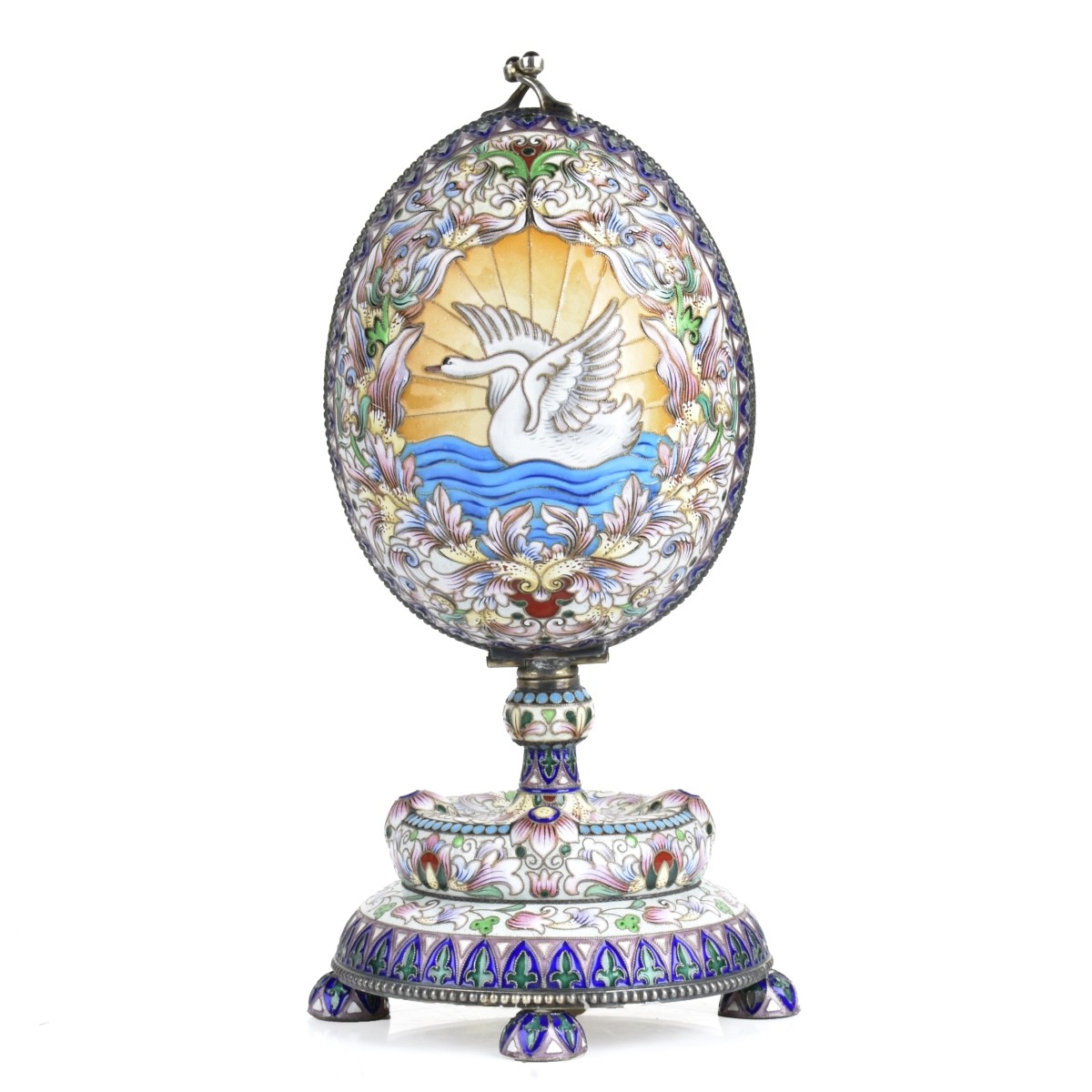 Fine Russian Cloisonne Enamel Silver Gilt Egg on Stand. Polychrome enamel floral and geometric design with swan in a brilliant sun in the center front and back. Richly detailed throughout with raised relief flowers, cabochon garnet accented clasp, opening to gilt interior with finely carved crystal swan with garnet eyes. Mark of Maria Semenova, 1894, Russian imperial warrant mark and 84 silver standard mark. Measures 7-1/8" H, 3-5/8" W (at base). Approx. weight: 601.35 grams. Provenance: Purchased circa 2002 Gallery 24 Antiques, New York, NY. Condition: Very good condition. Estimate: $2000.00 - $3000.00 Domestic Shipping: $65.00