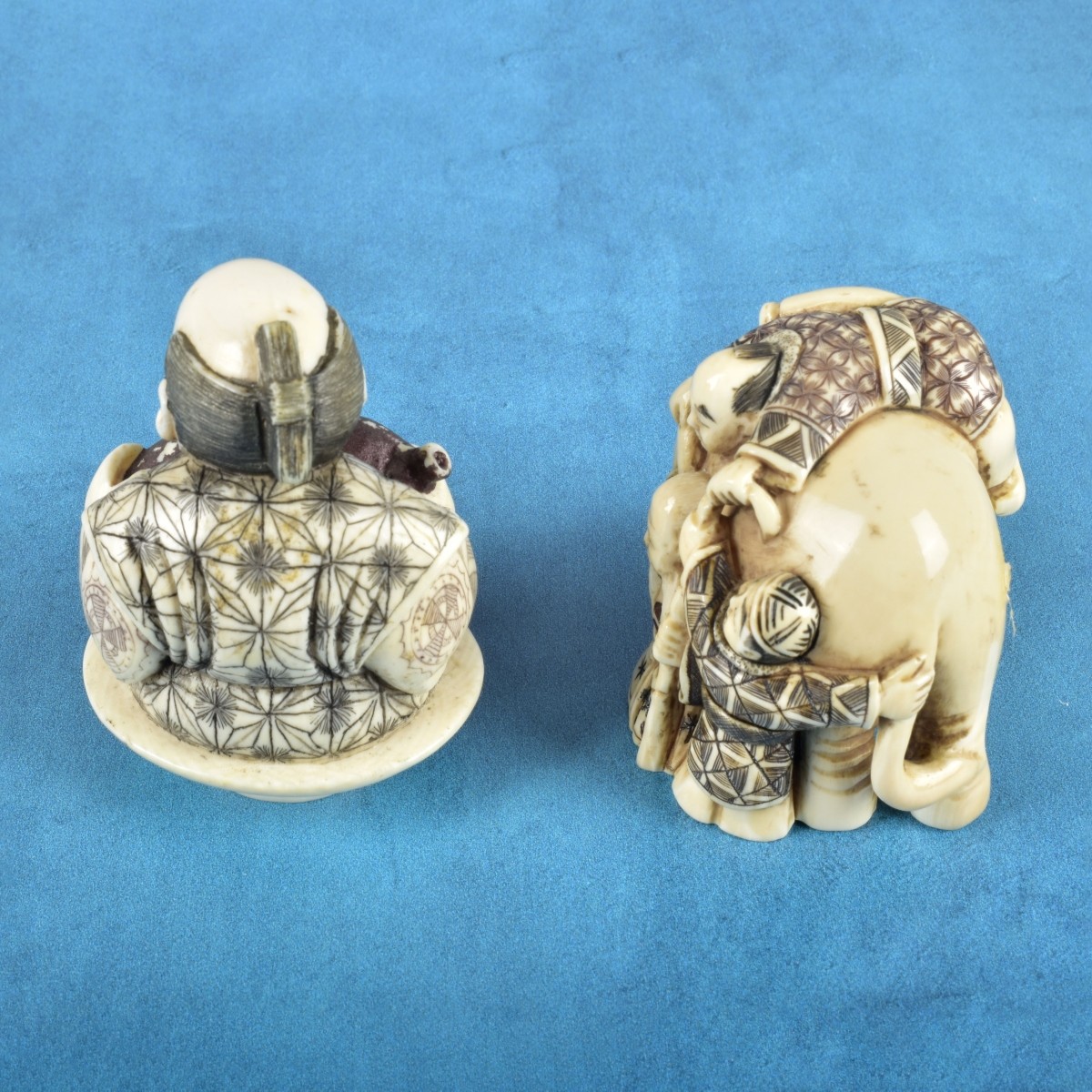 Grouping of Two Antique Japanese Polychrome Painted and Carved Netsukes. Both are marked on the base. Tallest measures 2-3/8" x 1-3/4". Smallest measures 2" x 2". We Will Not Ship This Item Out of State of Florida. Anyone Having This Item Shipped Must Have a Florida Address or the Item will not be Shipped. We will Not Knowingly Sell Endangered Species outside of Legal Channels. Condition: One has some rubbing to the paint otherwise good condition. Estimate: $100.00 - $300.00 Domestic Shipping: $40.00