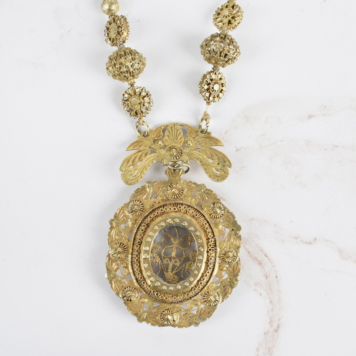 Antique Spanish Colonial Gold Plated Over Silver Filigree Beaded Tambourine Necklace Accompanied with Matching Earrings. Necklace is marked 1/20 12KGF on the hoop clasp. Necklace measures 28" (unclasped). Pendant measures 2-1/4" x 1-7/8". Earrings measure 1-3/4" H x 5/8" W. Altogether weighs approx. 90.8 grams. Condition: Good condition. Estimate: $100.00 - $400.00 Domestic Shipping: $40.00