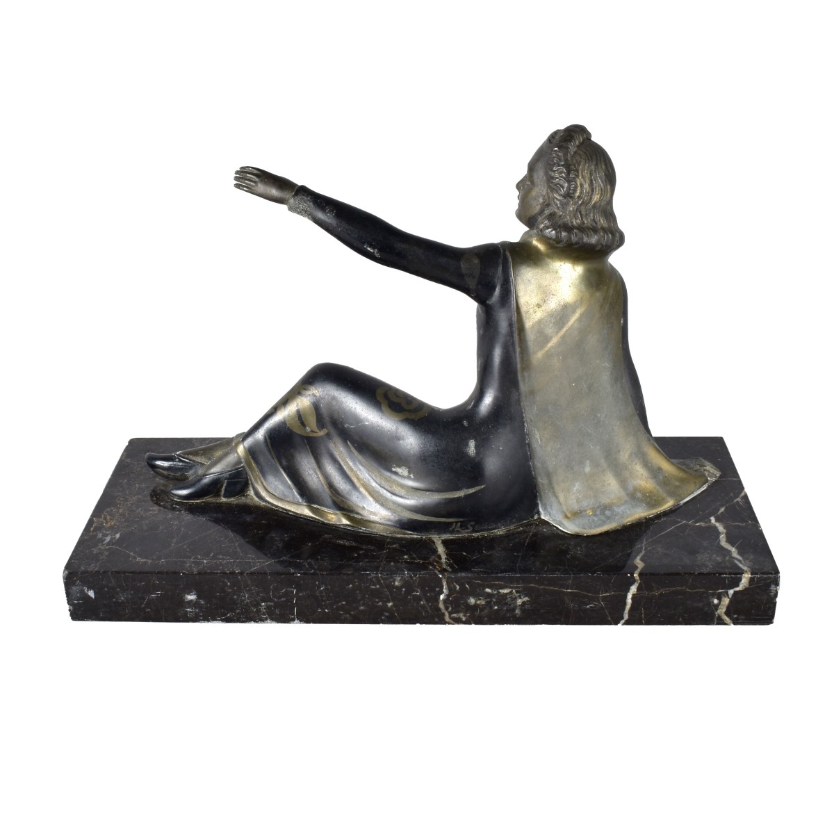 M. Secondo (20th Century) French Metal Sculpture on Marble Base "Reclining Nymph" Signed on Obverse Side. Overall measures 8-3/4" x 13-1/8" x 5-3/8". Condition: Rubbing and scuffs to the surface. Estimate: $100.00 - $300.00 Domestic Shipping: $88.00