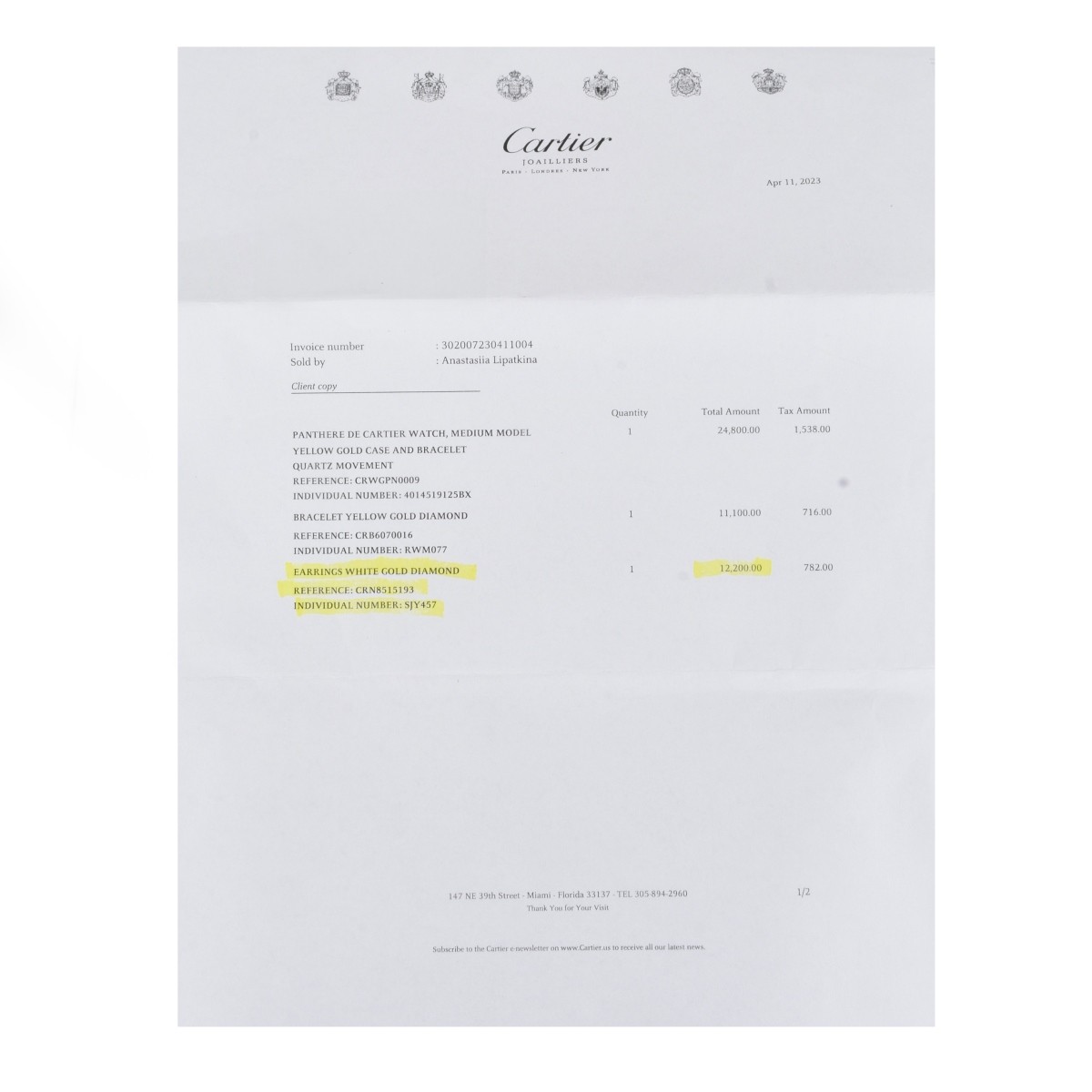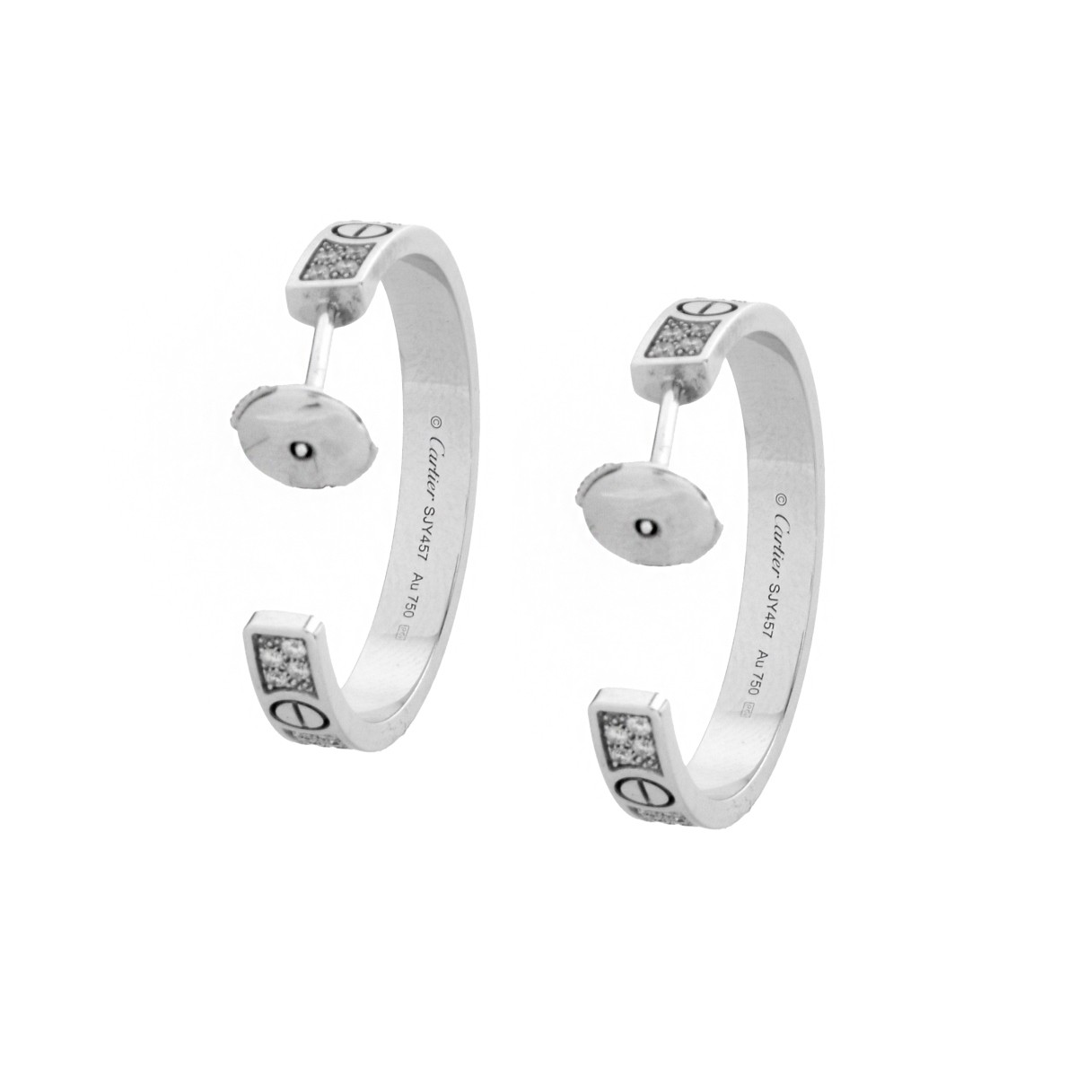 Cartier Pave Set Round Brilliant Cut Diamond and 18 Karat White Gold Love Hoop Earrings. Signed, stamped 750, numbered SJV 457. Measure 1" diameter, 1/8" W. Approx. total weight: 9.11 grams. Accompanied by Cartier Certificate of Authentication dated 4/112023, copy of purchase receipt dated 4/11/2023 and Cartier box. Condition: As New condition. For additional information and/or WhatsApp video please contact our resident GIA Graduate Gemologist, Russ Kodner at 954.650.5030 Estimate: $6000.00 - $8000.00 Domestic Shipping: $44.00