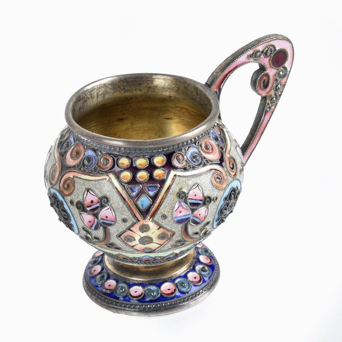 Russian Cloisonne Enamel Silver Gilt Small Pedestal Charka. Polychrome enamel floral and geometric arts and crafts design. Mark of the 11th Masters Artel, 84 silver standard mark. Measures 2-1/4" H, 2-5/8" W. Approx. weight: 63.49. Provenance: Purchased circa 1993 at Barbara P. Alpren Antiques, West Orange, NJ. Condition: Very good condition. Estimate: $400.00 - $600.00 Domestic Shipping: $40.00