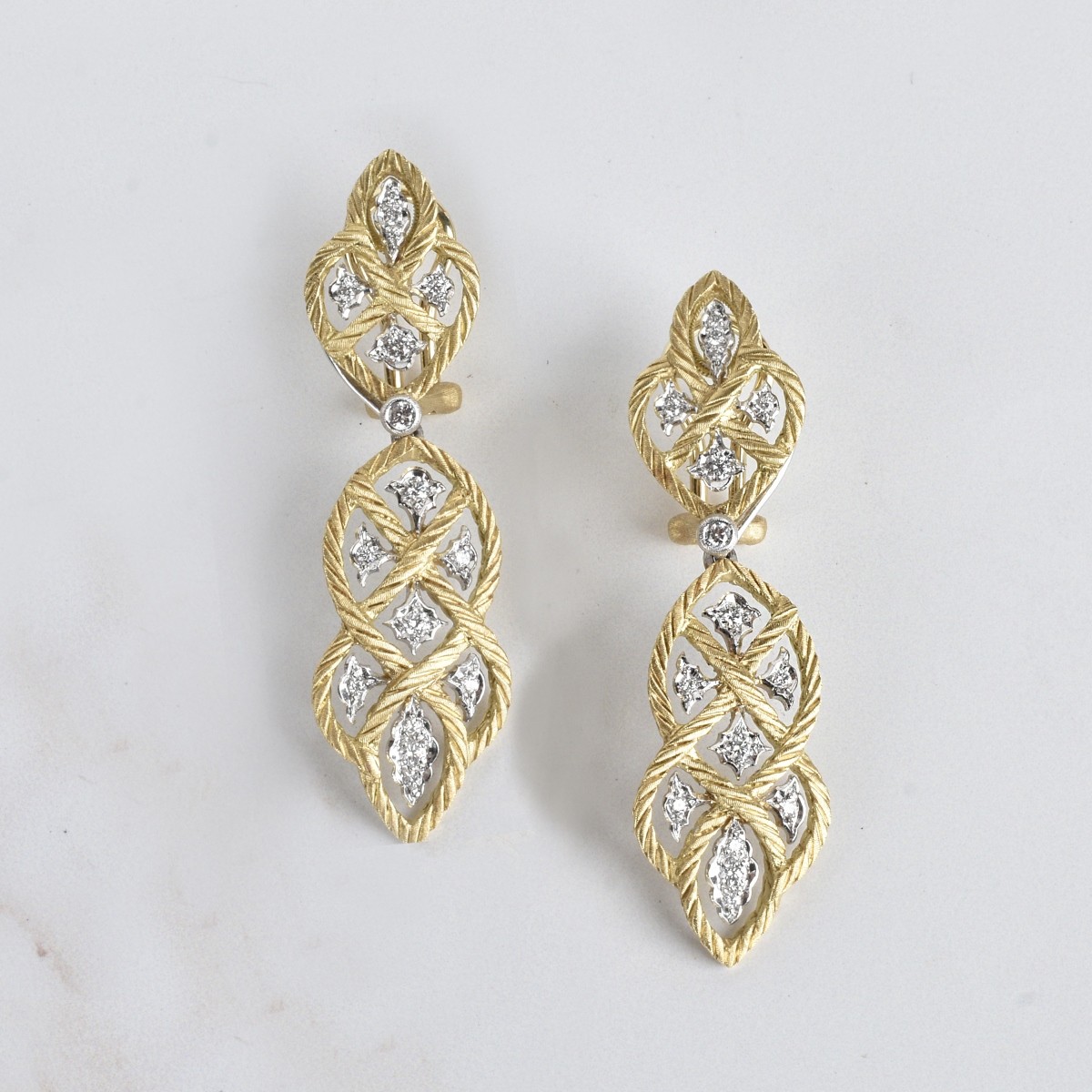 Vintage Italian Buccellati Diamond and 18 Karat Yellow and White Gold Necklace and Detachable Pendant Drop Earrings. Set throughout with numerous round brilliant cut diamonds, D-E color, VS clarity. Signed, stamped Italy 18K, 750 and Italian hallmark. Necklace measures 16" L (7/8" L top section only); earrings measure 2-1/8" L (7/8" L top section only), 9/16"W. Approx. total weight: 62.42 grams. Condition: Very good condition. For additional information and/or WhatsApp video please contact our resident GIA Graduate Gemologist, Russ Kodner at 954.650.5030 Estimate: $20,000.00 - $30,000.00 Domestic Shipping: $42.00