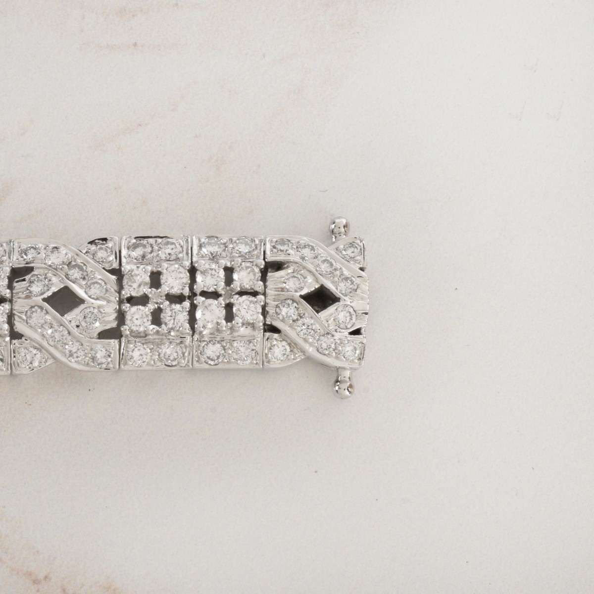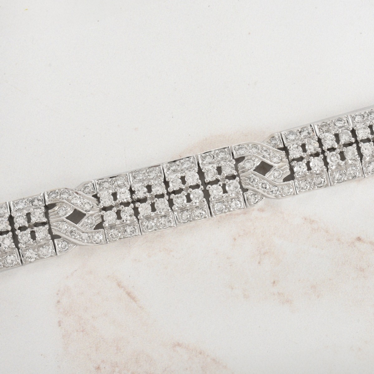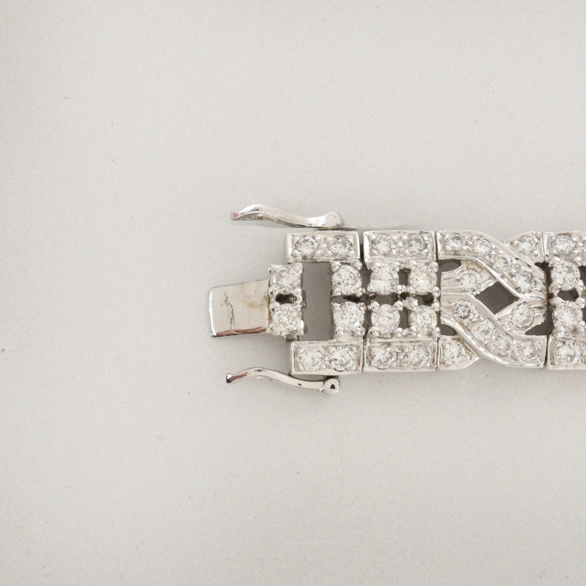 Fine Vintage Approx. 10.0 Carat TW Round Brilliant Cut Diamond and 18 Karat White Gold Bracelet. Diamonds F-G-H color, VS1-SI2 clarity. Stamped 18K. Measures 7-1/8" L, 1/2" W. Approx. weight: 54.86 grams. Condition: Very good condition. For additional information and/or WhatsApp video please contact our resident GIA Graduate Gemologist, Russ Kodner at 954.650.5030 Estimate: $10,000.00 - $15,000.00 Domestic Shipping: $40.00
