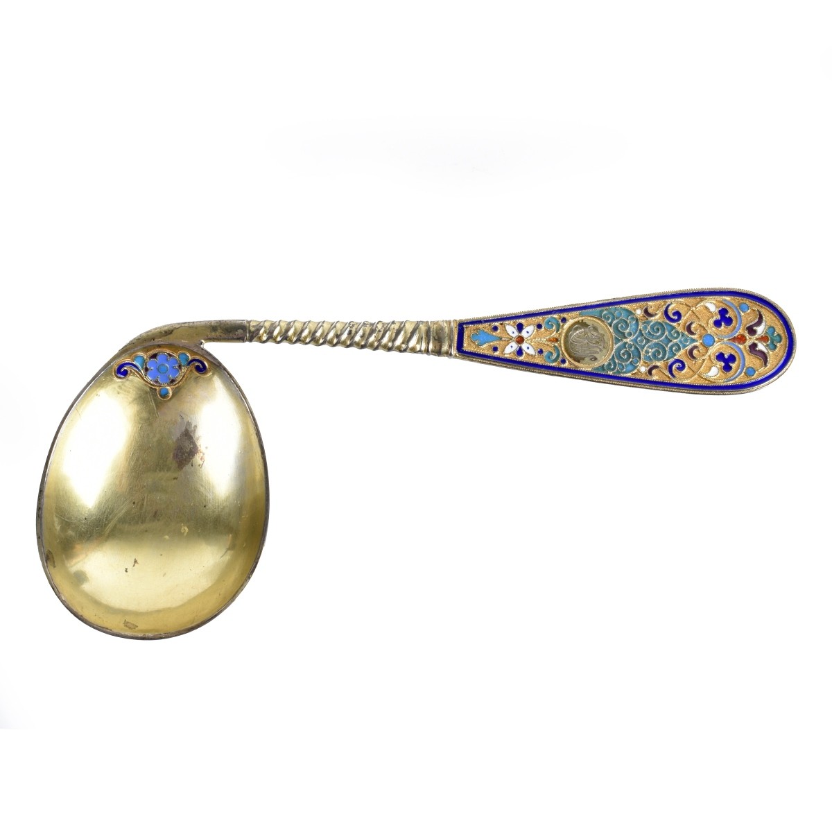 Russian Cloisonne Enamel Silver Gilt Serving Spoon. Polychrome enamel floral design. Unusual bent form, twist stem with monogram CBW, gilt bowl. Mark of Antip Kuzmichov, 88 silver standard mark. Measures 6-5/8" L, 2-3/4" W. Approx. weight: 78.26 grams. Condition: Very good condition. Estimate: $500.00 - $700.00