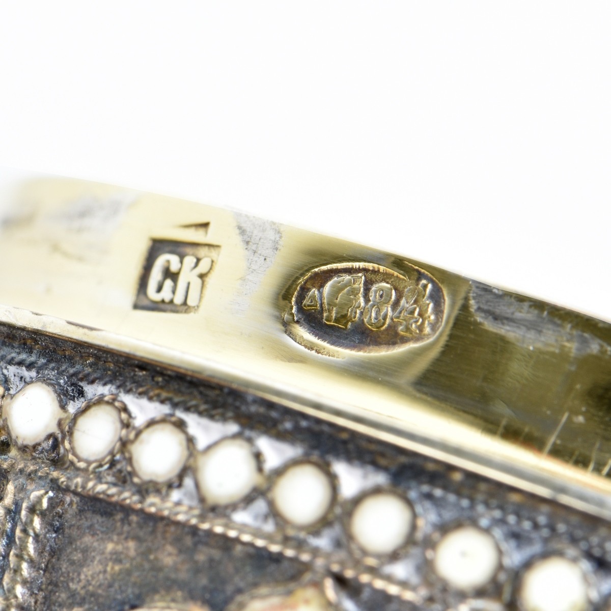 Russian Cloisonne Enamel Silver Egg. Polychrome enamel floral design accented with cabochon garnets. Gilt interior. Maker's mark CK, 84 silver standard mark. Measures 3" H, 2" W. Approx. weight: 102.49 grams. Provenance: Purchased circa 1999 from Fred's Antiques, Fillmore, NY. Condition: Very good condition. Estimate: $700.00 - $900.00 Domestic Shipping: $40.00