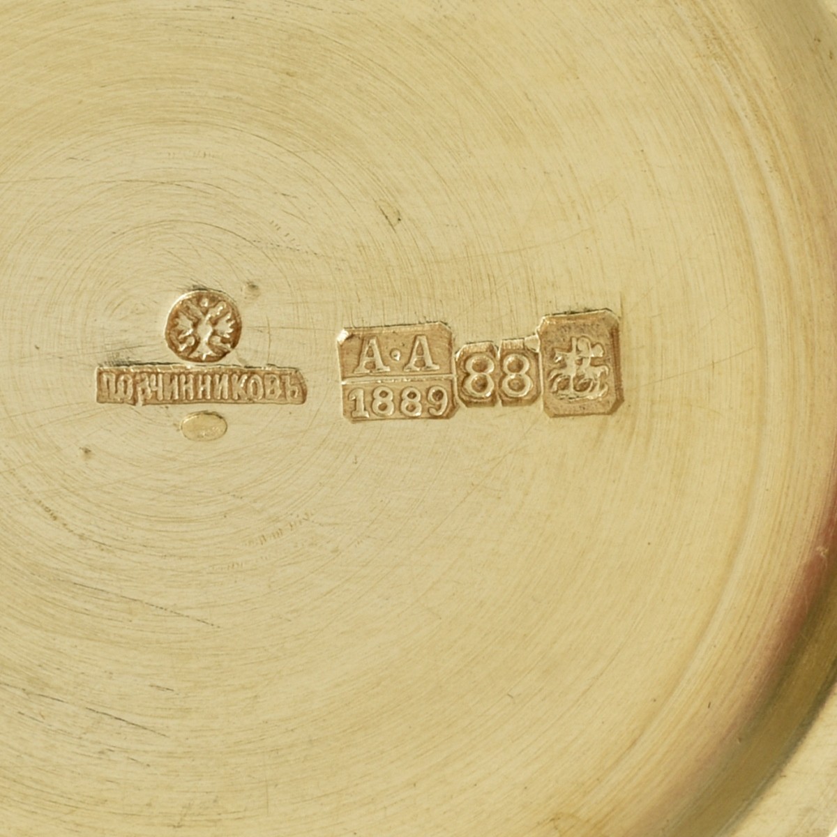 Very Fine Pavel Ovchinnikov (Russian 1830-1888) Circa 1884 Seven Piece Polychrome Cloisonne Enamel Silver Gilt Tea Set. Comprising tea pot, covered sugar, creamer, sugar tongs, strainer, sugar scoop and lemon fork. Polychrome enamel floral and geometric design. Gilt interiors. Mark of Pavel Ovchinnikov, 88 silver standard mark, Imperial warrant and dated 1884. Tea pot measures 5" H; sugar bowl measures 5: H; creamer measures 3-1/4" H. Approx. total weight: 1103.73 grams. Provenance: Purchased circa 1991 at Garry, Marche Brion, Paris Condition: Very good condition. Estimate: $15,000.00 - $20,000.00 Domestic Shipping: $125.00