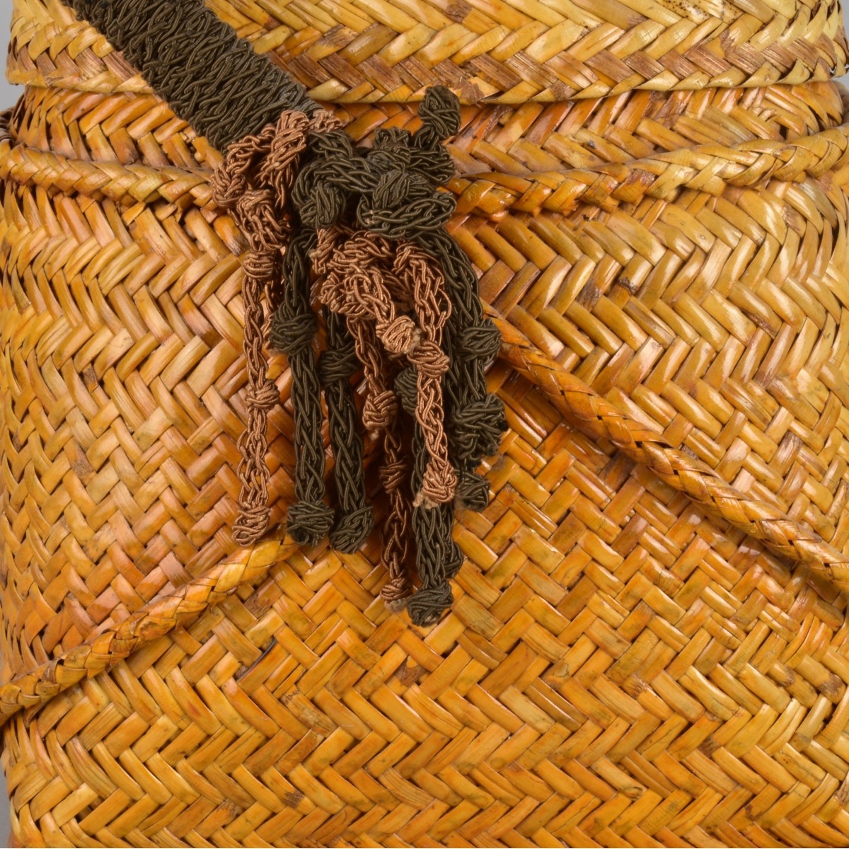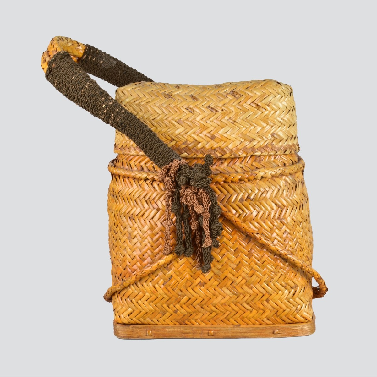 Vintage Chinese Interwoven Wicker Covered Basket. Measures 11-5/8" x 9-1/4" x 6". Condition: Good condition. Estimate: $100.00 - $400.00 Domestic Shipping: $88.00