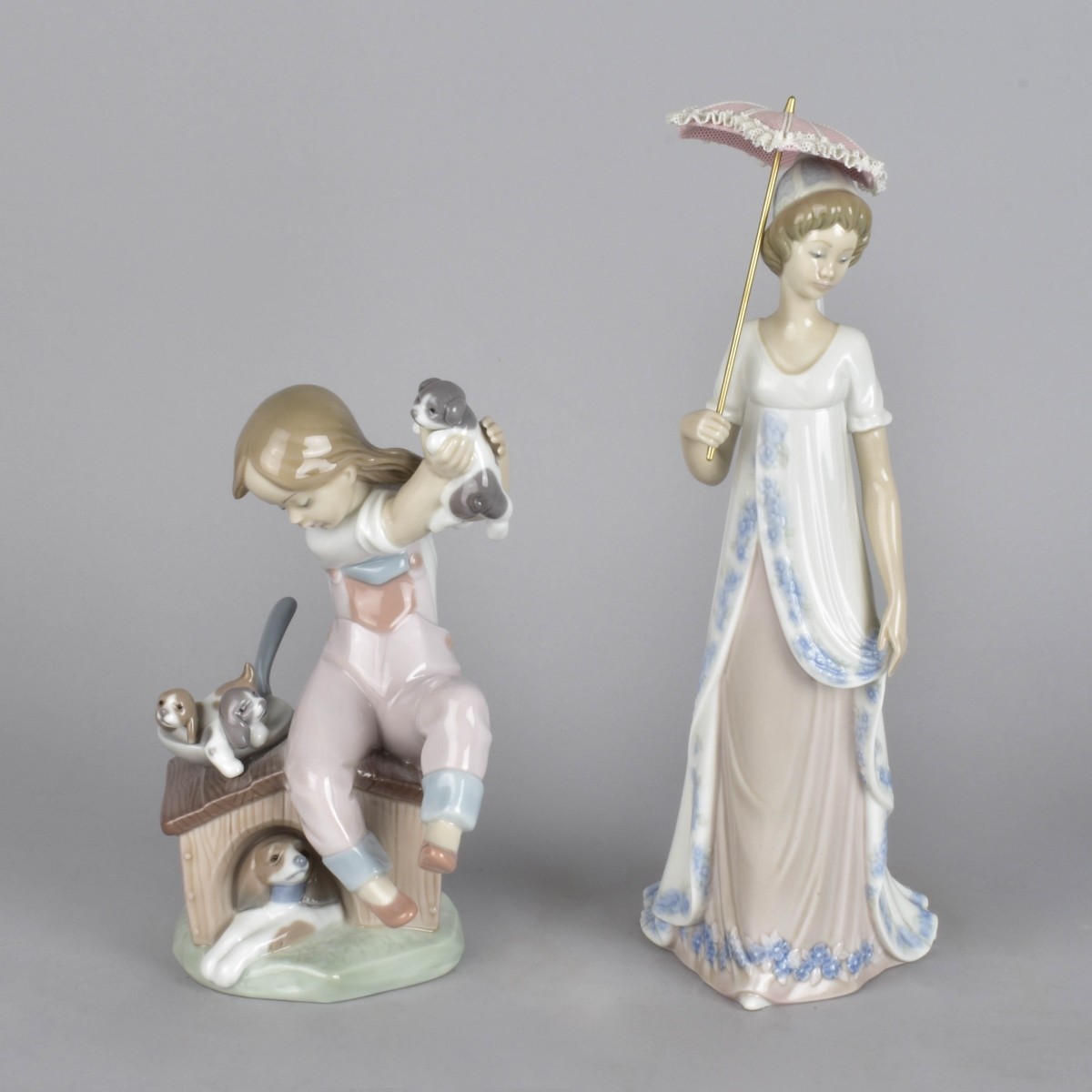 Grouping of Two Lladro Porcelain Figurines. Includes: "Pick of the Litter" and "Lady with Parasol". Each signed on the base. Tallest measures 11" x 3-3/4" x 5". Remaining figurine measures 7-1/2" x 4-1/4" x 5". Condition: Umbrella has a small loss to a section otherwise good condition. Estimate: $100.00 - $200.00 Domestic Shipping: $75.00