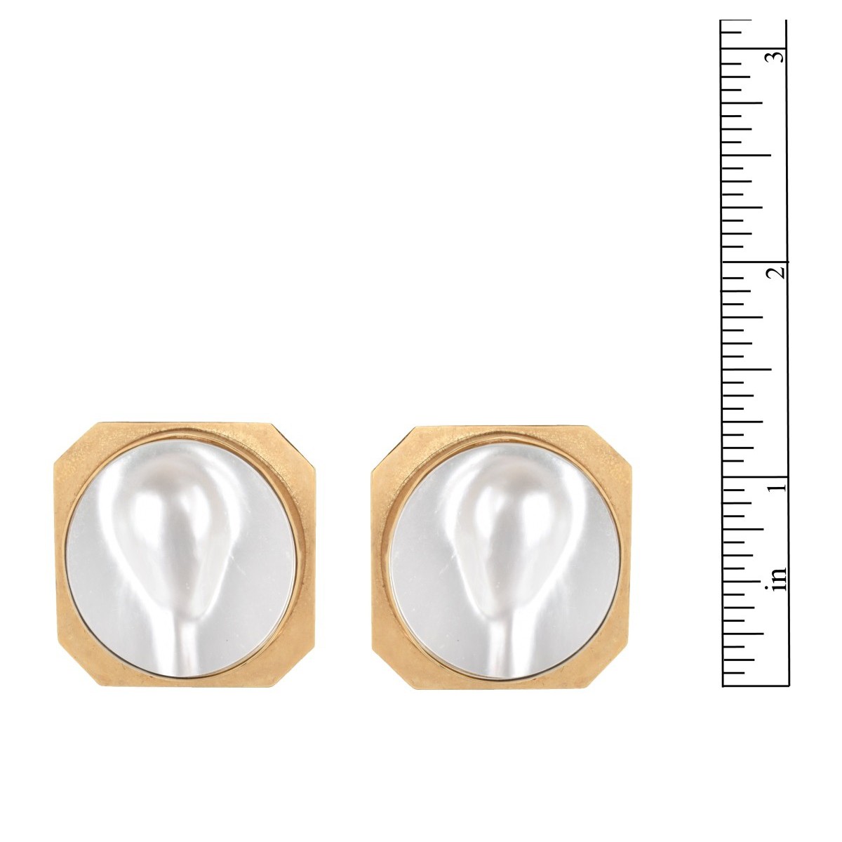 Large Mabe Pearl and 14 Karat Yellow Gold Earrings. Pearls with good luster and polish. Earrings measure 1-1/4" square. Approx. weight: 22.66 grams. Condition: Good vintage condition. Need cleaning. For additional information and/or WhatsApp video please contact our resident GIA Graduate Gemologist, Russ Kodner at 954.650.5030 Estimate: $500.00 - $800.00 Domestic Shipping: $40.00