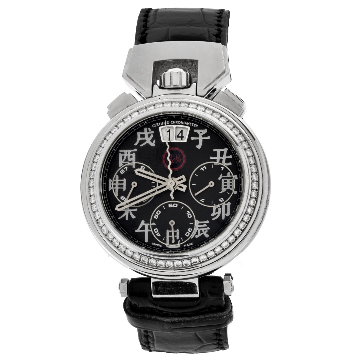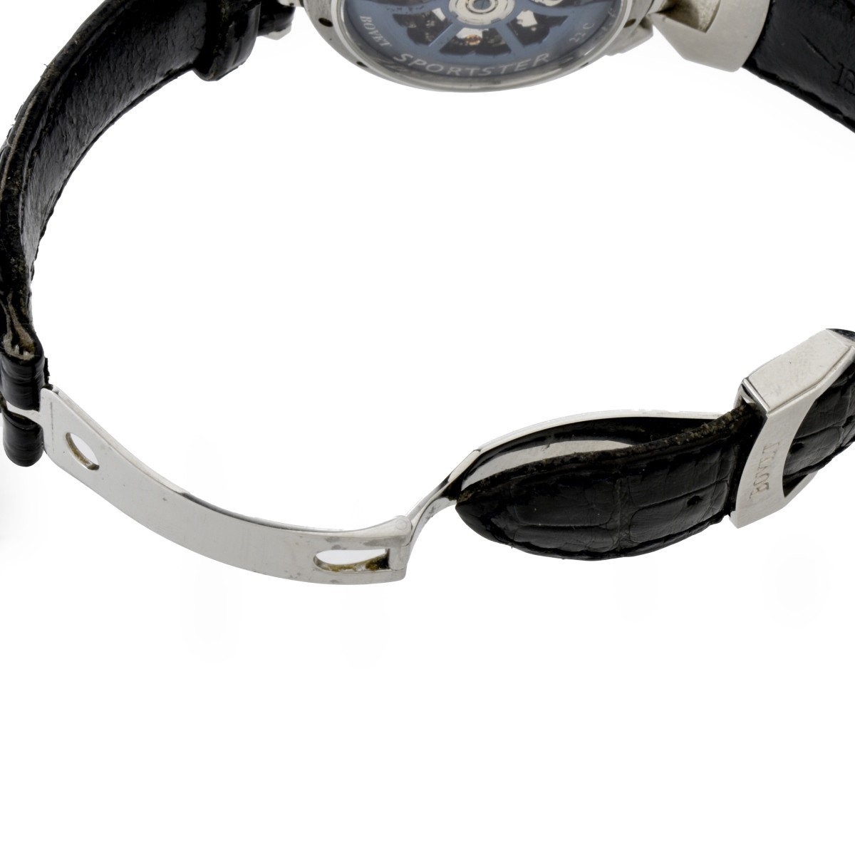 Bovet Sportster Stainless Steel Chronograph Watch, Diamond Bezel, Leather Bracelet, Black Dial, Japanese Hour Markers. Automatic self winding movement. Case measures 38mm. Bracelet measures 6-1/2" interior circumference. No box or papers. Condition: Very good pre-owned condition. Light wear from normal use. Running. Please note the gallery does not warranty the running condition of watches. For additional information and/or WhatsApp video please contact our resident GIA Graduate Gemologist, Russ Kodner at 954.650.5030 Estimate: $2000.00 - $3000.00 Domestic Shipping: $40.00