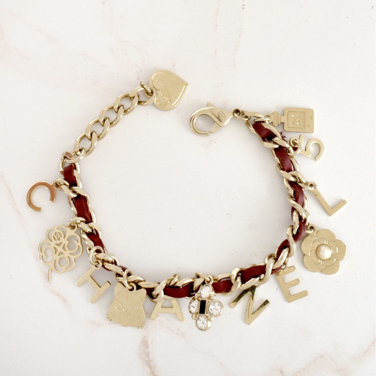 Chanel Charm Bracelet. Includes 12 charms with two having faux pearl and crystal embellishment. Largest measuring 7/8" x 5/8". Bracelet measures 9-1/2". Provenance: The Orianne Collins Collection. A large portion of proceeds of this sale will be donated to Ms Collinsí charity of choice, the "Never Give Up Foundation" which fills in the gaps needed to build a more inclusive future for those with disabilities like Spinal Muscular Atrophy.y. Condition: Good used condition. Estimate: $100.00 - $500.00 Domestic Shipping: $40.00