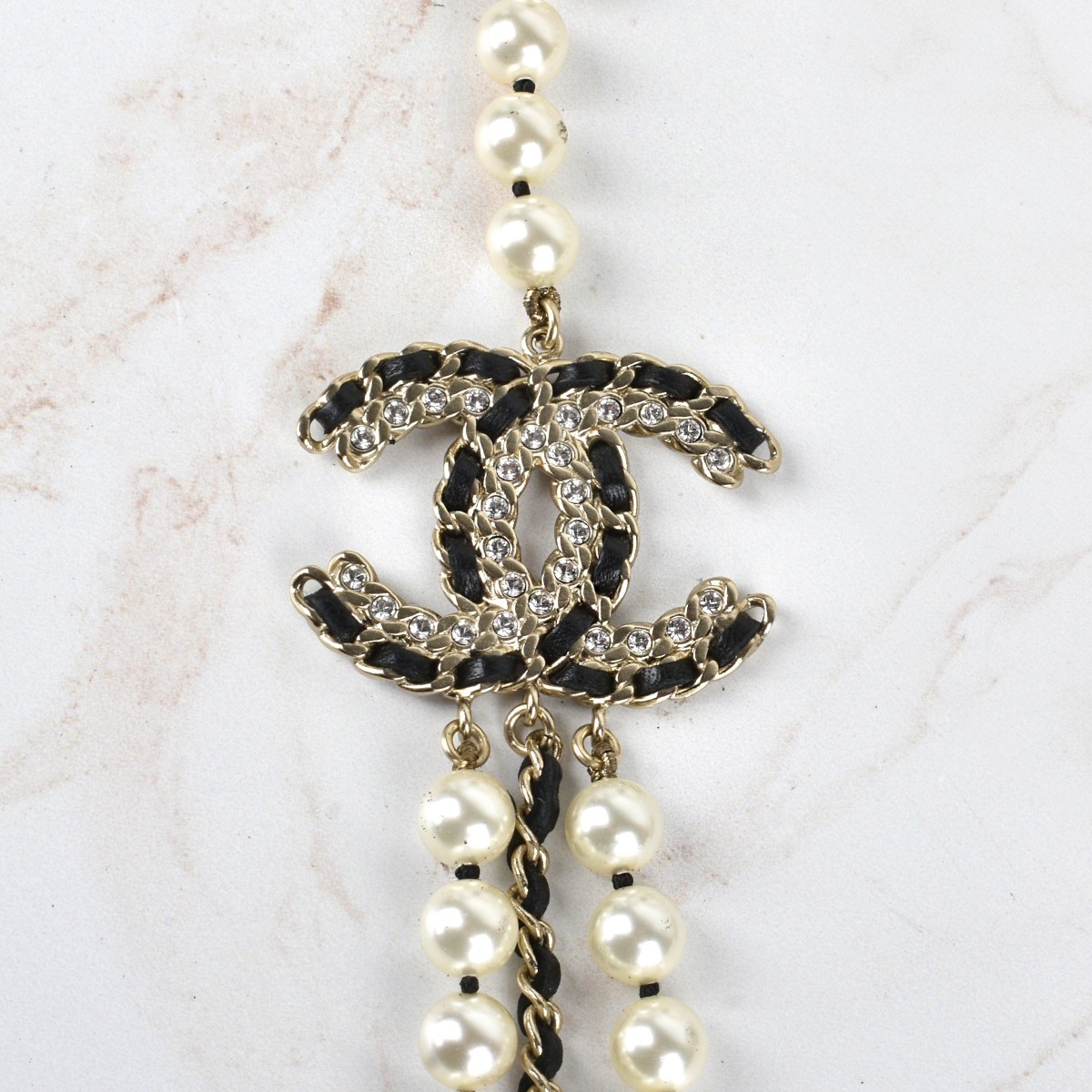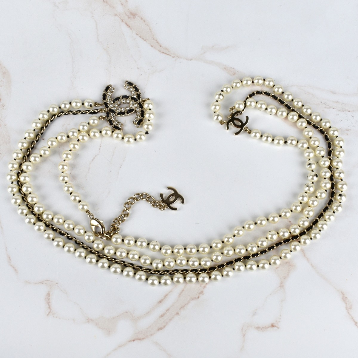 Chanel Multi Strand Faux Pearl Belly Chain with Double C with Inset Crystal Charm. Chanel pouch to accompany the lot. Pearl size: 8mm. Overall length 40-1/2". Provenance: The Orianne Collins Collection. A large portion of proceeds of this sale will be donated to Ms Collinsí charity of choice, the "Never Give Up Foundation" which fills in the gaps needed to build a more inclusive future for those with disabilities like Spinal Muscular Atrophy. Condition: Good condition. Estimate: $600.00 - $1200.00 Domestic Shipping: $40.00