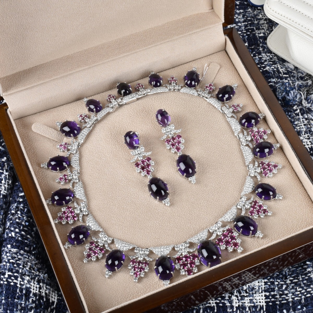 Exceptional and Fine Approx. 215.0 Carat TW Twenty Oval Cabochon Amethyst, 22.0 Carat TW Eighty-four Round Cut Rubelite, 28.50 Carat TW Round Brilliant Cut Diamond and 18 Karat White Gold Necklace and Earrings Suite. Gem quality stones throughout. Diamonds E-F color, VS clarity. Necklace measures 15" L, 1-1/4" drop. Earrings measure 2-3/8" L 3/4" W. Approx. total weight: 186.12 Condition: Very good condition. For additional information and/or WhatsApp video please contact our resident GIA Graduate Gemologist, Russ Kodner at 954.650.5030 Estimate: $60,000.00 - $80,000.00 Domestic Shipping: $44.00
