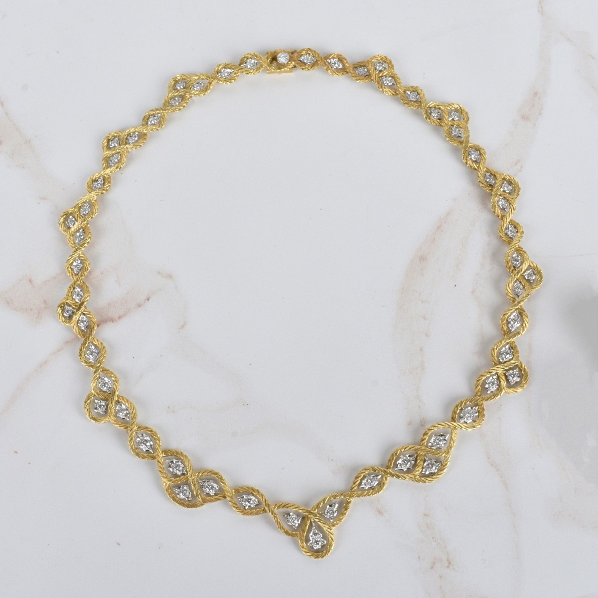 Vintage Italian Buccellati Diamond and 18 Karat Yellow and White Gold Necklace and Detachable Pendant Drop Earrings. Set throughout with numerous round brilliant cut diamonds, D-E color, VS clarity. Signed Buccellati, stamped Italy 18K, 750 and Italian hallmark. Necklace measures 16" L; earrings measure 2-1/8" L (7/8" L top section only), 9/16"W. Approx. total weight: 62.42 grams. Condition: Very good condition. For additional information and/or WhatsApp video please contact our resident GIA Graduate Gemologist, Russ Kodner at 954.650.5030 Estimate: $20,000.00 - $30,000.00 Domestic Shipping: $42.00