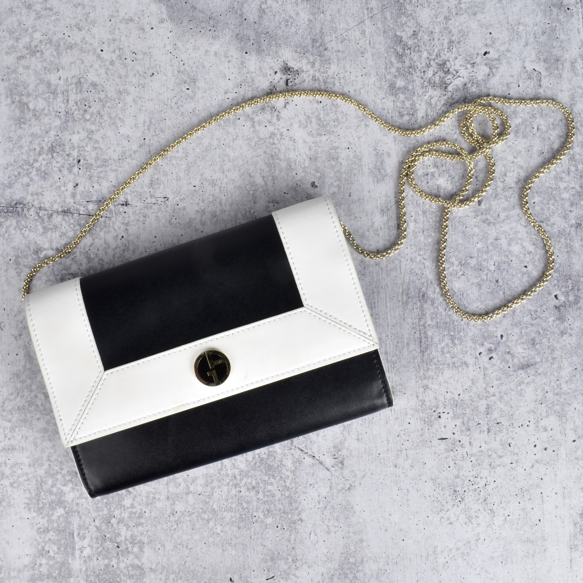 Giorgio Armani Black and White Leather Shoulder Bag. Flap closure that opens to interior patch pockets and zippered compartment. Measures 5-1/4" x 7-3/4". Provenance: The Orianne Collins Collection. A large portion of proceeds of this sale will be donated to Ms Collinsí charity of choice, the "Never Give Up Foundation" which fills in the gaps needed to build a more inclusive future for those with disabilities like Spinal Muscular Atrophy. Condition: Needs a routine cleaning. Estimate: $500.00 - $1000.00 Domestic Shipping: $45.00