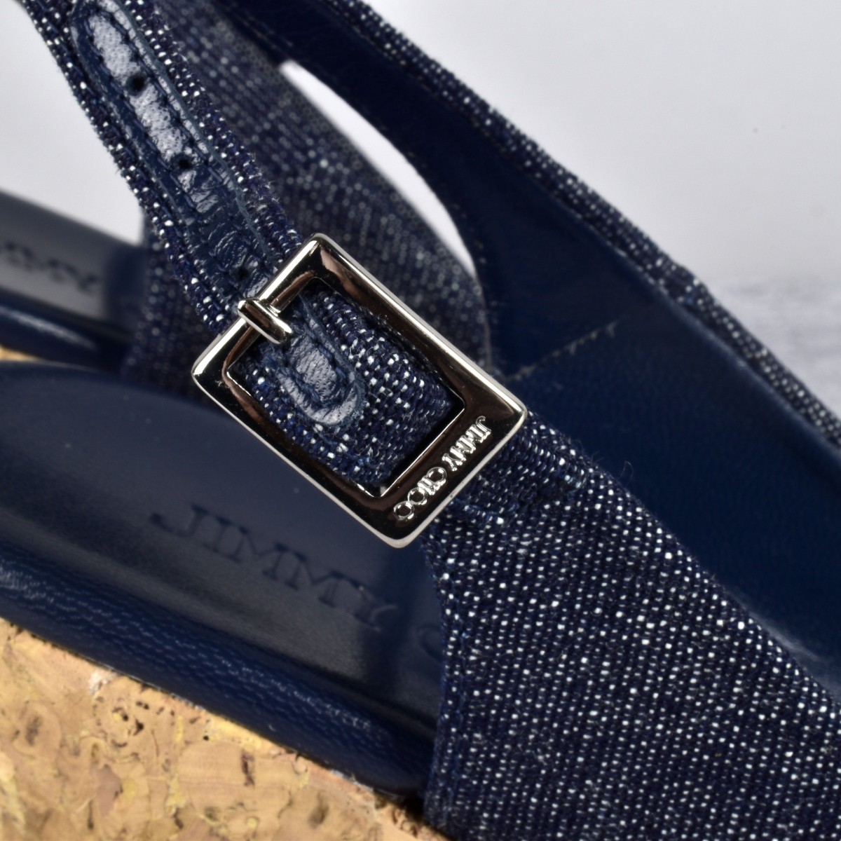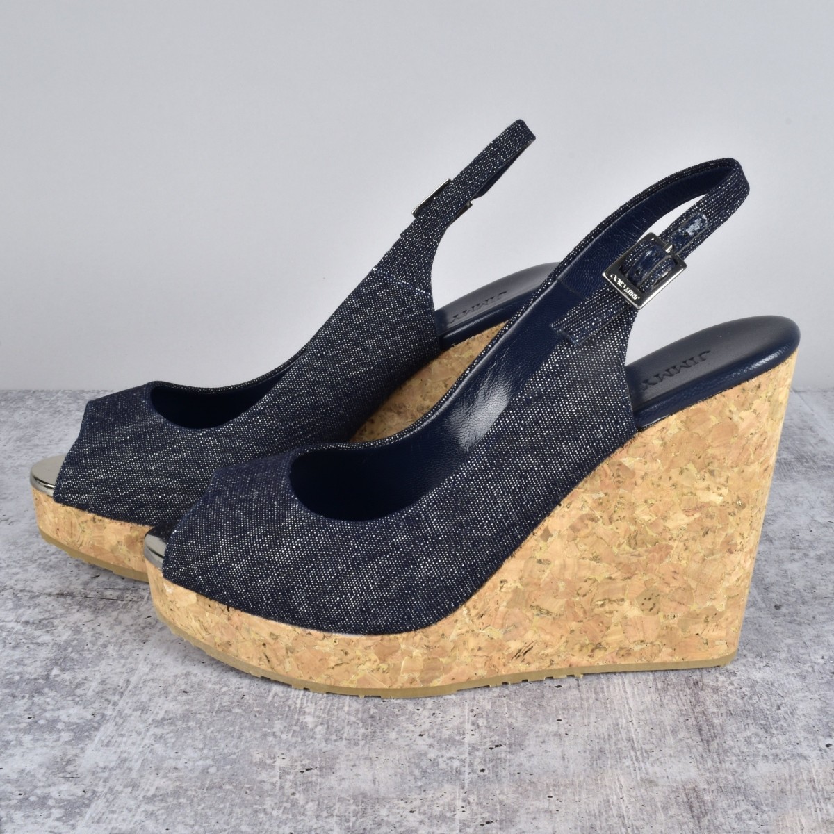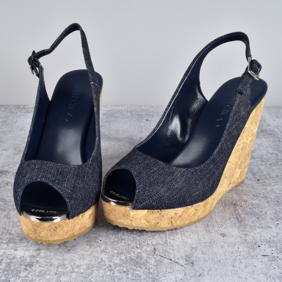 Jimmy Choo Praise Cork Wedge Sandals. Marked at the front and bottom side. Size: 38-1/2.Provenance: The Orianne Collins Collection. A large portion of proceeds of this sale will be donated to Ms Collinsí charity of choice, the "Never Give Up Foundation" which fills in the gaps needed to build a more inclusive future for those with disabilities like Spinal Muscular Atrophy. Condition: Good condition. Estimate: $100.00 - $500.00 Domestic Shipping: $58.00