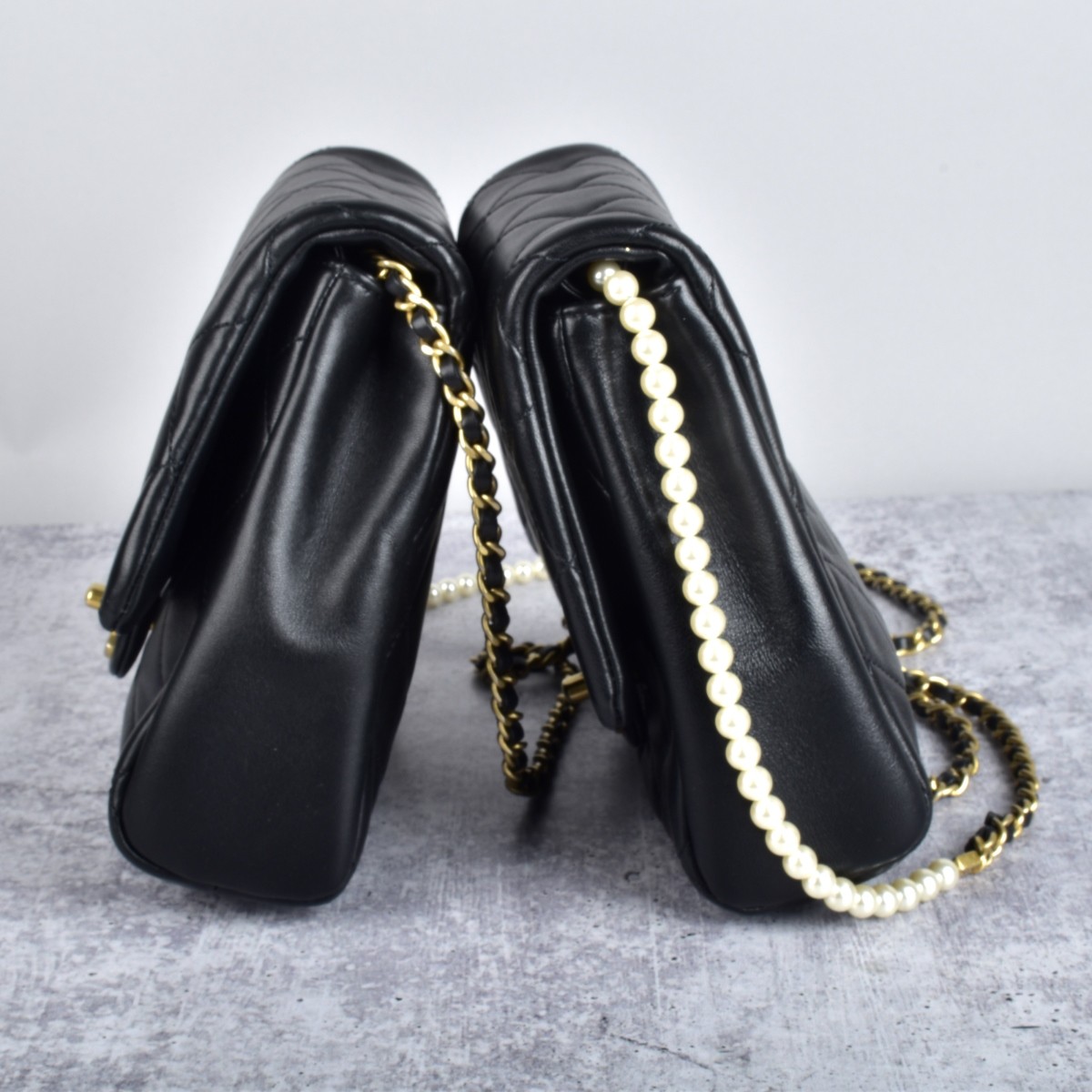 Chanel Quilted Lambskin Side - Pack Bags with Gold Tone Hardware and Faux Pearl Embellishments. Twist lock closure. COA card to accompany the lot. Measures 7" x 6-7/8" x 2-1/4". Provenance: The Orianne Collins Collection. A large portion of proceeds of this sale will be donated to Ms Collinsí charity of choice, the "Never Give Up Foundation" which fills in the gaps needed to build a more inclusive future for those with disabilities like Spinal Muscular Atrophy. Condition: Good condition. Estimate: $1000.00 - $3000.00 Domestic Shipping: $62.00