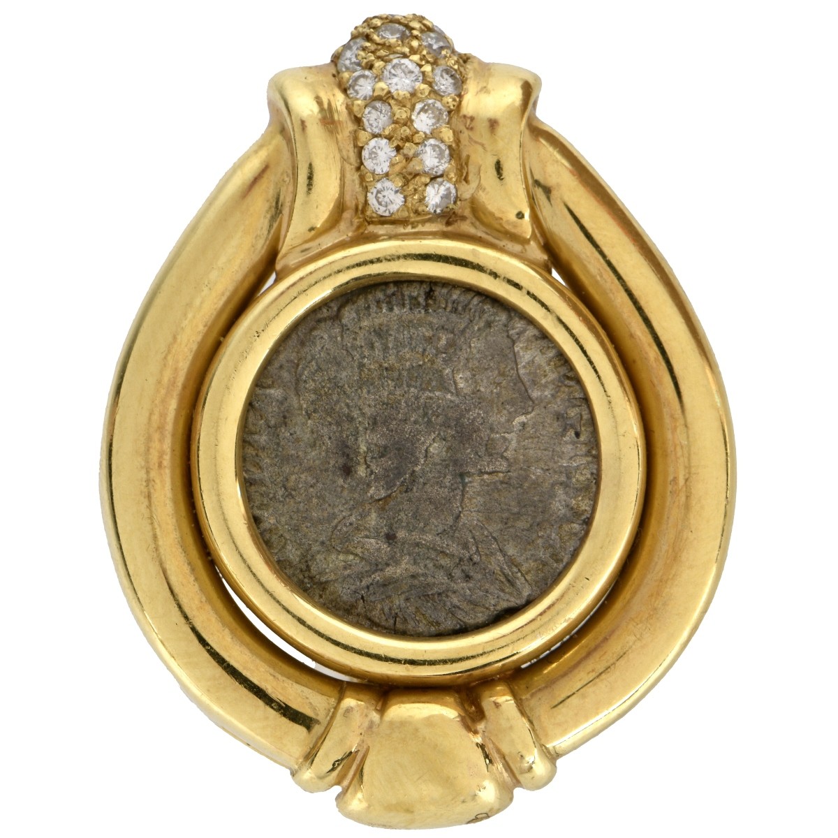 Vintage Continental Approx. 1.0 Carat TW Pave Set Round Brilliant Cut Diamond and 18 Karat Yellow Gold Earrings each set with an Ancient Roman Coin. Diamonds E-F color, VS1 clarity. Measure 1-1/4" H, 1" W. Approx. total weight: 40.94 grams. Condition: Very good vintage condition. For additional information and/or WhatsApp video please contact our resident GIA Graduate Gemologist, Russ Kodner at 954.650.5030 Estimate: $2000.00 - $3000.00 Domestic Shipping: $40.00