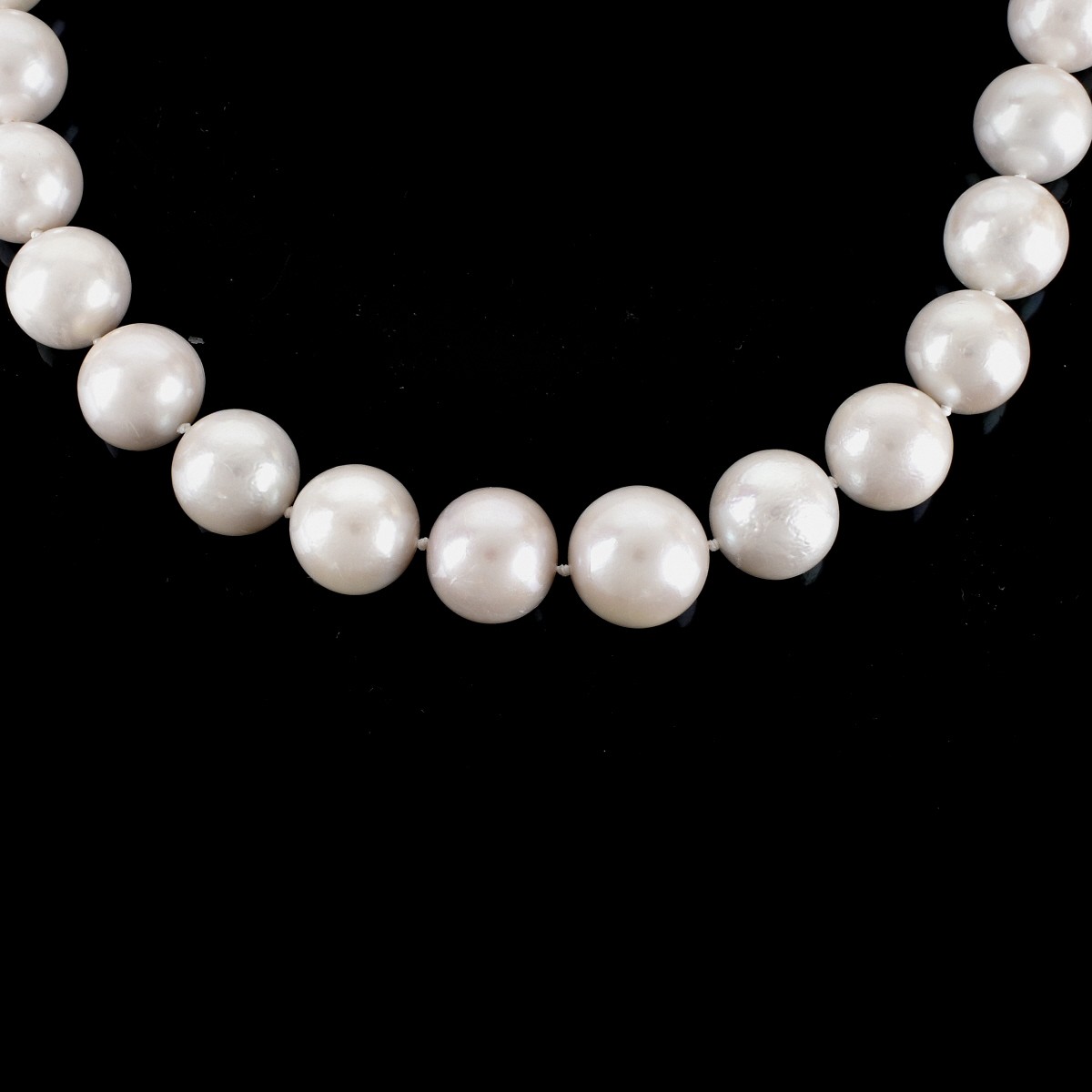 Single Strand 12.0-14.5mm South Sea Pearl Necklace with Diamond and 18 Karat Yellow Gold Clasp. Pearls with good luster and polish, minor natural blemishes, slight pinkish overtones. Clasp stamped 750. Necklace measures 17-1/2" long. Approx. weight: 95.46 grams. Condition: Very good condition. For additional information and/or WhatsApp video please contact our resident GIA Graduate Gemologist, Russ Kodner at 954.650.5030 Estimate: $3000.00 - $4000.00 Domestic Shipping: $40.00