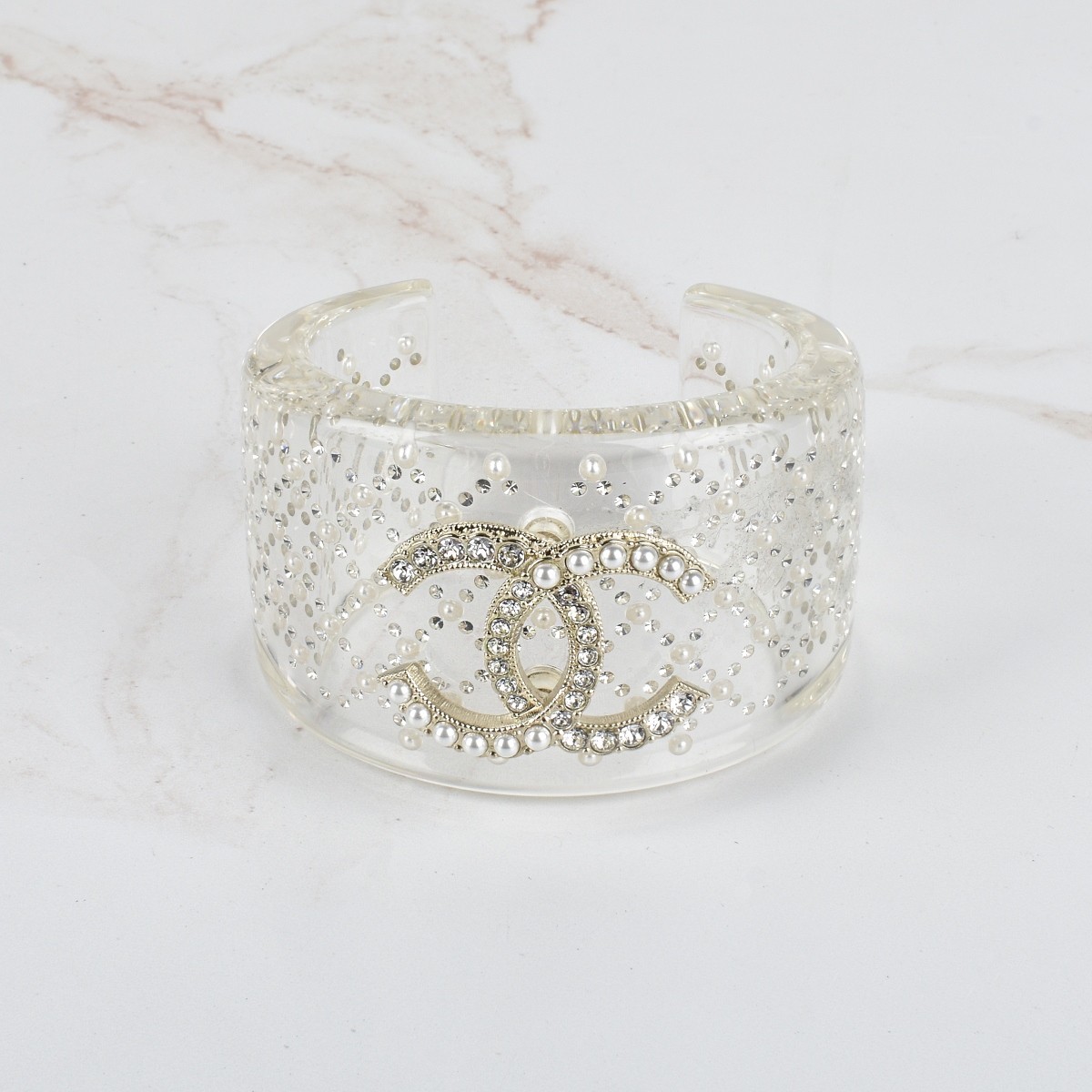Chanel CC Acrylic Cuff Bracelet with Crystals and Faux Pearl Embellishments. Chanel pouch to accompany the lot. Measures 5-3/4" interior diam., 2" H x 3" W. Provenance: The Orianne Collins Collection. A large portion of proceeds of this sale will be donated to Ms Collinsí charity of choice, the "Never Give Up Foundation" which fills in the gaps needed to build a more inclusive future for those with disabilities like Spinal Muscular Atrophy. Condition: Good condition. Estimate: $100.00 - $300.00 Domestic Shipping: $40.00