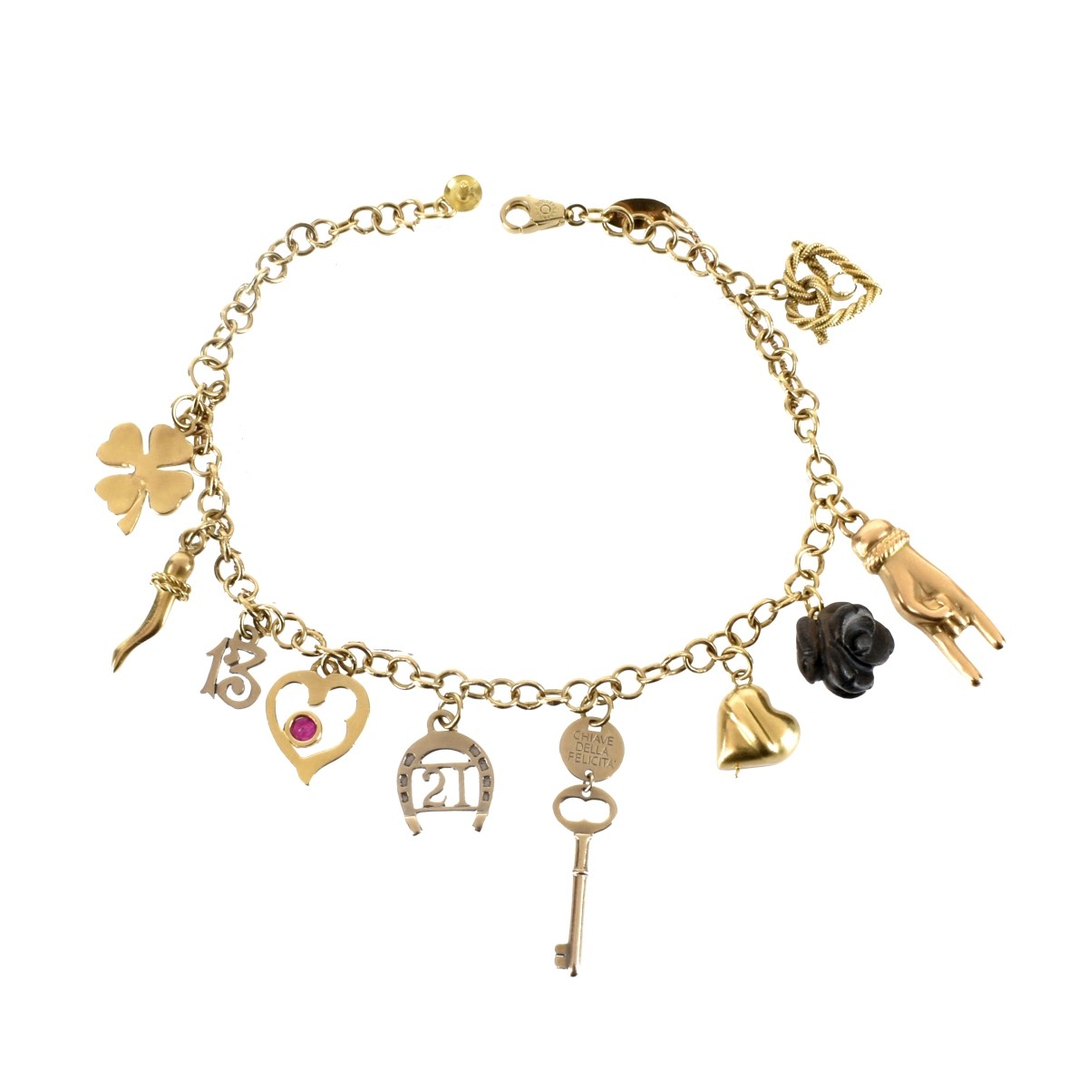 Vintage Dolce & Gabbana 18 Karat Yellow Gold Charm Bracelet. Signed, stamped 750, Italian hallmark. Measures 8-3/4" L. Approx. weight: 17.79 grams. Provenance: The Orianne Collins Collection. A large portion of proceeds of this sale will be donated to Ms Collinsí charity of choice, the "Never Give Up Foundation" which fills in the gaps needed to build a more inclusive future for those with disabilities like Spinal Muscular Atrophy. Condition: Very good condition. Estimate: $400.00 - $600.00 Domestic Shipping: $40.00