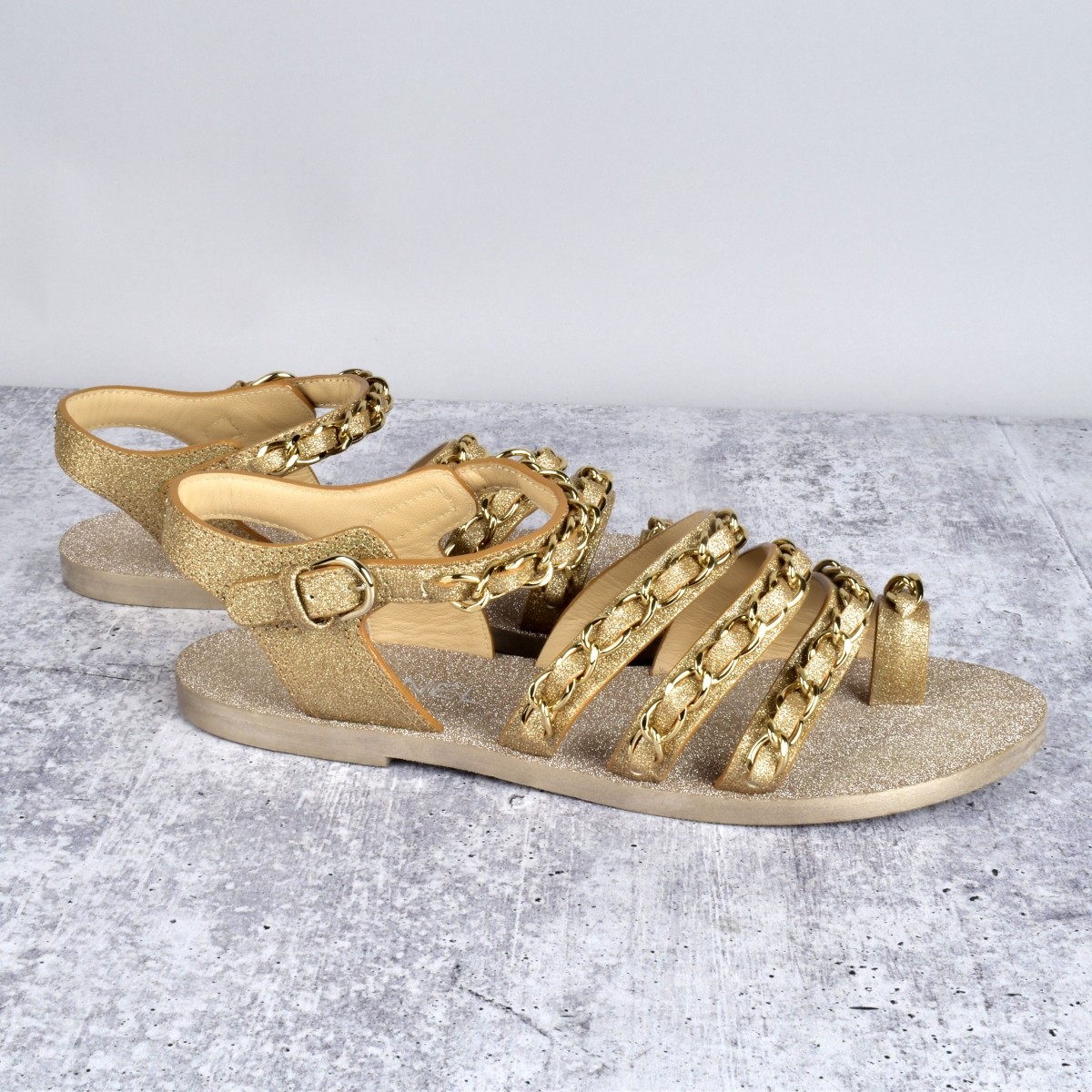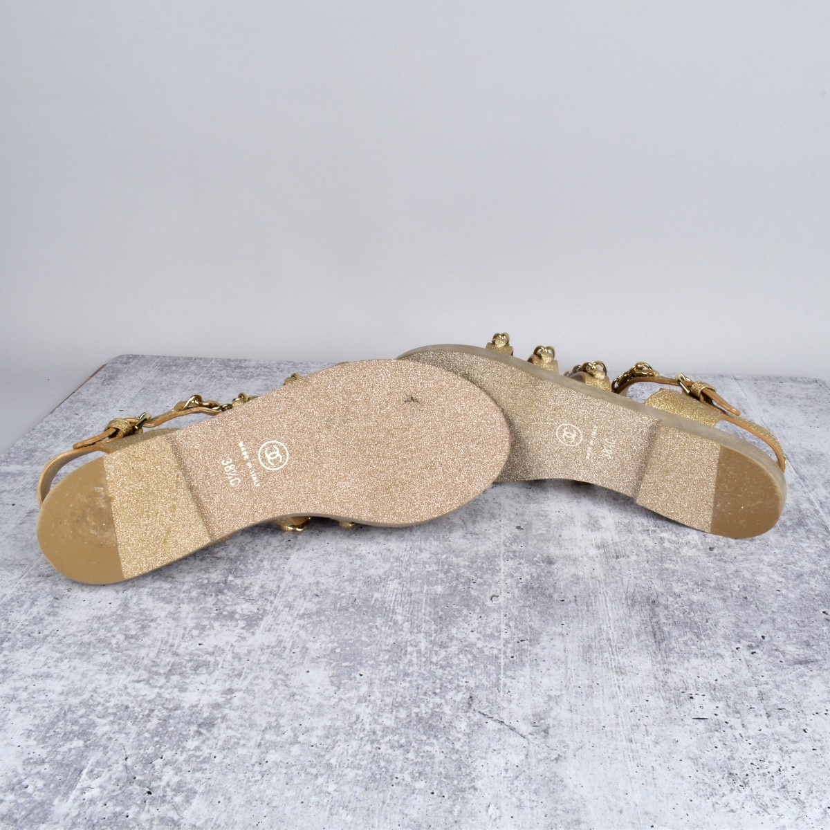 Chanel Metallic Gold Leather single toe Sandal, with Styrappy Chain Detail. Size Womens 38-1/2C. Provenance: The Orianne Collins Collection. A large portion of proceeds of this sale will be donated to Ms Collinsí charity of choice, the "Never Give Up Foundation" which fills in the gaps needed to build a more inclusive future for those with disabilities like Spinal Muscular Atrophy. Condition: Good Condition,normal wear for a pre owned item. Estimate: $200.00 - $600.00 Domestic Shipping: $52.00