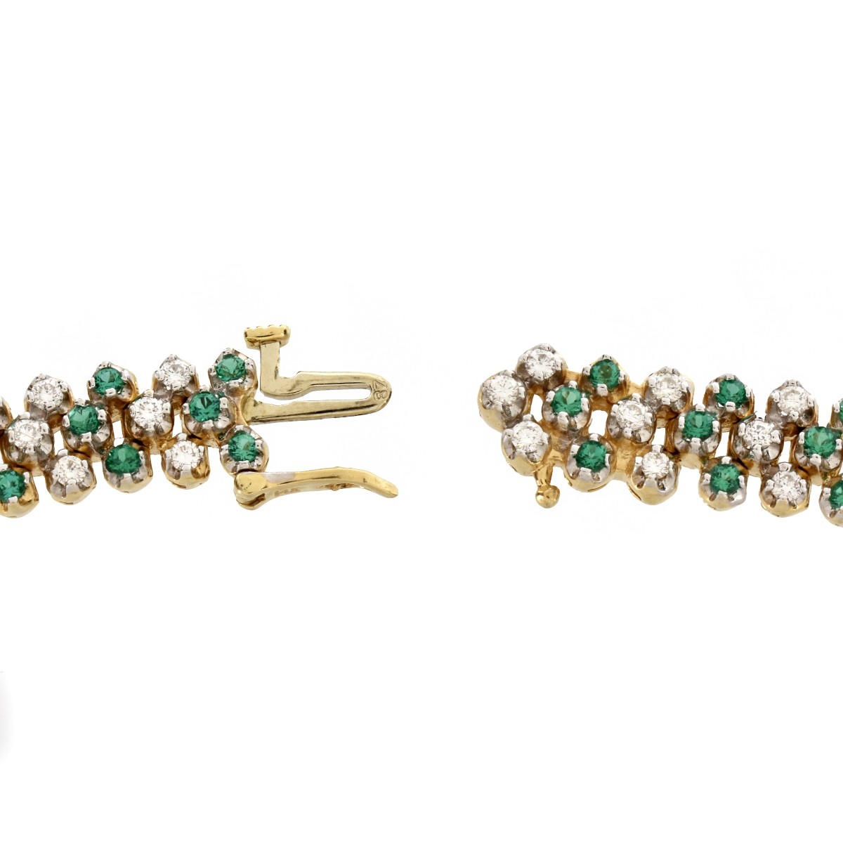 Approx. 5.50 Carat TW One Hundred Fifty-six Round Brilliant Cut Diamonds, 4.50 Carat TW One Hundred Fifty-three Round Cut Emeralds and 18 Karat Yellow Gold Necklace. Diamonds F-G color, VS clarity. Emeralds with good color and clarity. Measures 16-1/2" L, 5/16" W. Approx. weight: 69.0 grams. Condition: Very good condition. For additional information and/or WhatsApp video please contact our resident GIA Graduate Gemologist, Russ Kodner at 954.650.5030 Estimate: $7000.00 - $9000.00 Domestic Shipping: $40.00