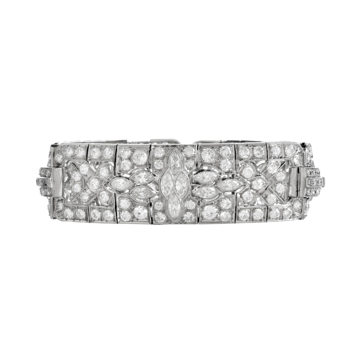 Fine Antique Art Deco Diamond and Platinum Bracelet. Set with Approx. 24.0 carat TW two hundred twenty-eight old European cut, baguette cut and marquise cut diamonds. Diamonds F-G color, VVS-VS clarity. Measures 7-3/8" L, 3/4" W. Approx. weight: 55.4 grams. Condition: Very good condition. For additional information and/or WhatsApp video please contact our resident GIA Graduate Gemologist, Russ Kodner at 954.650.5030 Estimate: $25,000.00 - $30,000.00 Domestic Shipping: $40.00