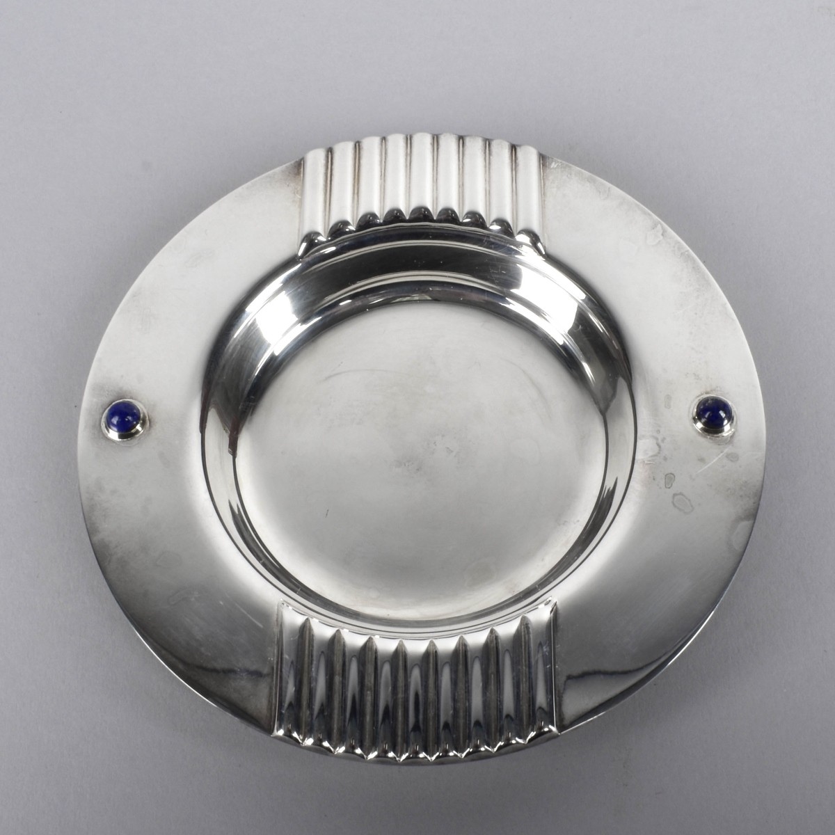 Cartier Silver Clad Ashtray with Two (2) Lapis Stone accents, From the Lapis Collection Spain, Signed to Bottom and 1990. Has original Box, Sleeve, Paperwork and Bag. Measures 5/8"H x 5-3/4"W Condition: Good Condition. sleeve is torn and box has a fold to edge. Estimate: $100.00 - $300.00 Domestic Shipping: $45.00