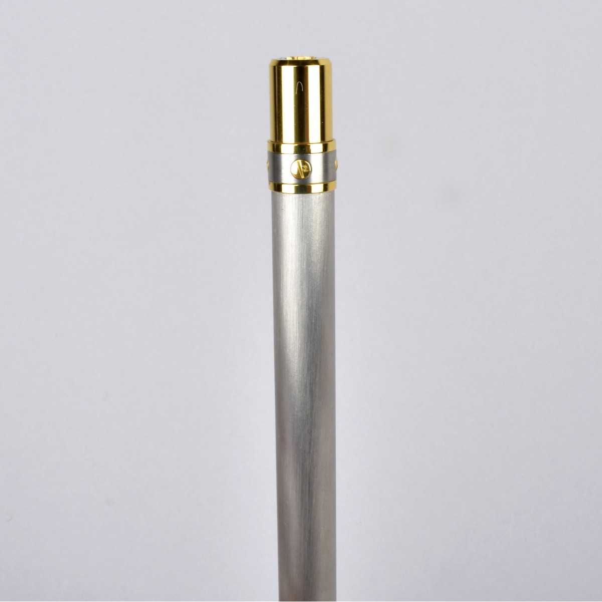 Cartier Mast Line de Santos Brushed Silver Color Gold Accent Ballpoint Pen. signed to top Cartier Box, leather sleeve and Papers. Measures 5-3/8"L Condition: Good Condition Estimate: $100.00 - $150.00 Domestic Shipping: $42.00