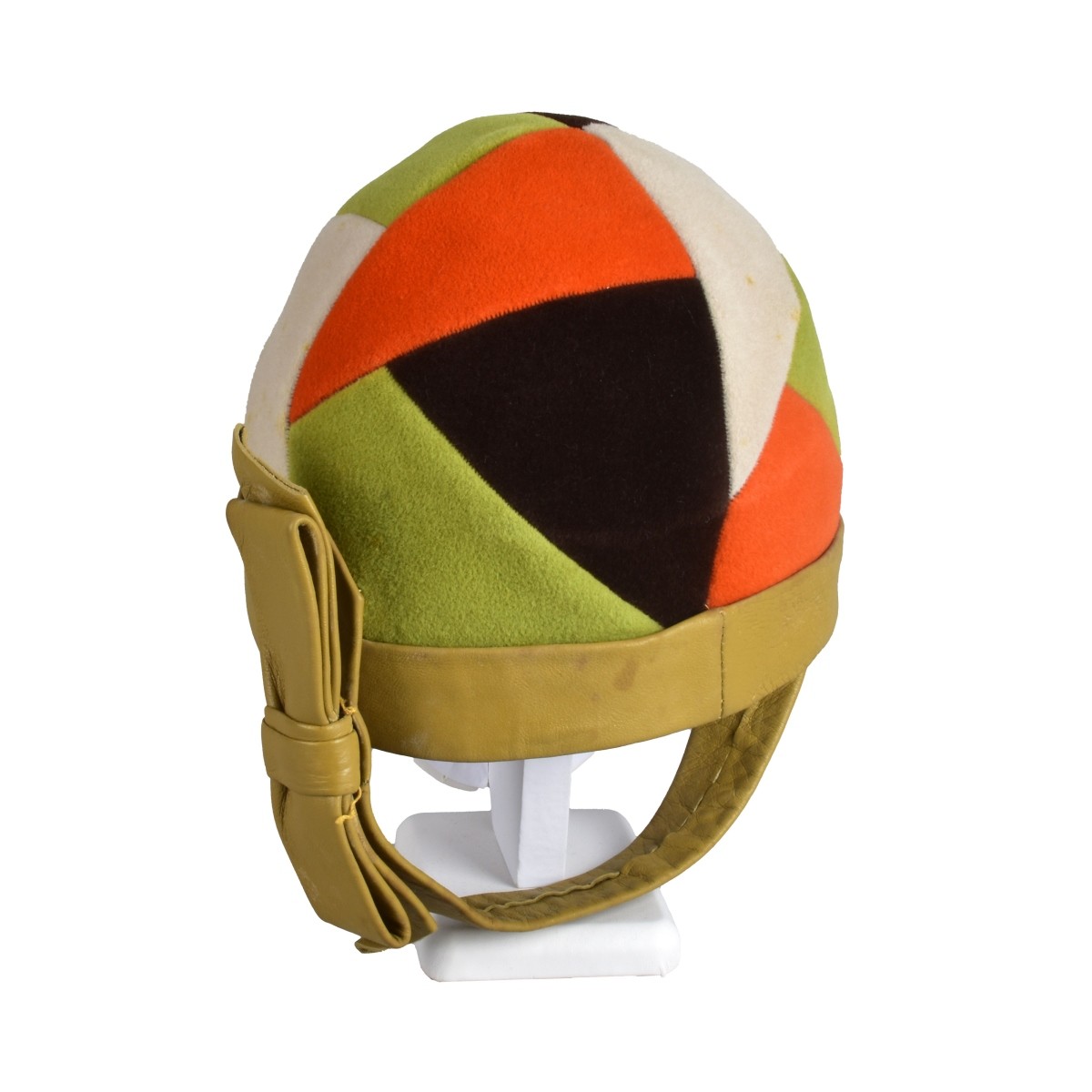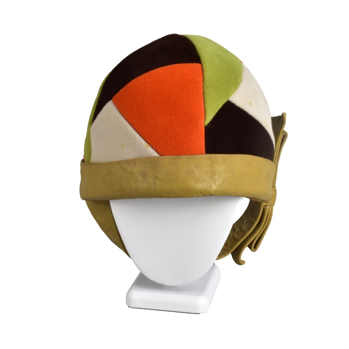Vintage Yves Saint Laurent Mondrian Helmet with Leather Chin Strap. Multicolor Orange,, Green, Brown, Camel, with leather Toffee Brown trim press stud fastening.. .Marked Yes Saint Laurent Paris, Velour Austria and Italy. Size 22 Condition: Good Condition, needs a cleaning some foxing. Estimate: $200.00 - $400.00 Domestic Shipping: $42.00