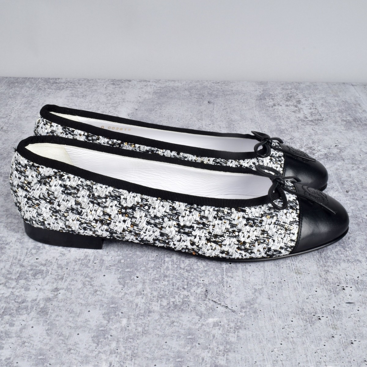 Chanel Double CC Sequin Ballet Flats with Leather Capped Toe. Serial: A G02819. Size: 8. Provenance: The Orianne Collins Collection. A large portion of proceeds of this sale will be donated to Ms Collinsí charity of choice, the "Never Give Up Foundation" which fills in the gaps needed to build a more inclusive future for those with disabilities like Spinal Muscular Atrophy. Condition: Good unused condition. Estimate: $100.00 - $500.00 Domestic Shipping: $62.00