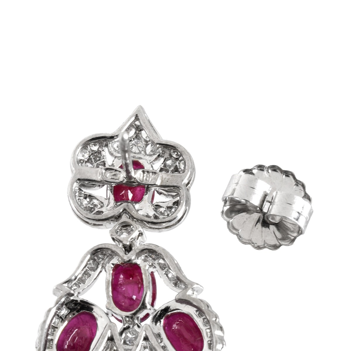 Approx. 15.0 Carat TW Fourteen Oval Cut Burma Ruby, 3.50 Carat Round Brilliant Cut Diamond and 18 Karat White Gold Chandelier Earrings. Rubies with vivid color. Diamonds E-F color, VS1-VS2 clarity. Stamped 18K. Measure 2" L, 7/8" W. Approx. total weight: 25.15 grams. Condition: Very good condition. For additional information and/or WhatsApp video please contact our resident GIA Graduate Gemologist, Russ Kodner at 954.650.5030 Estimate: $12,000.00 - $15,000.00 Domestic Shipping: $40.00