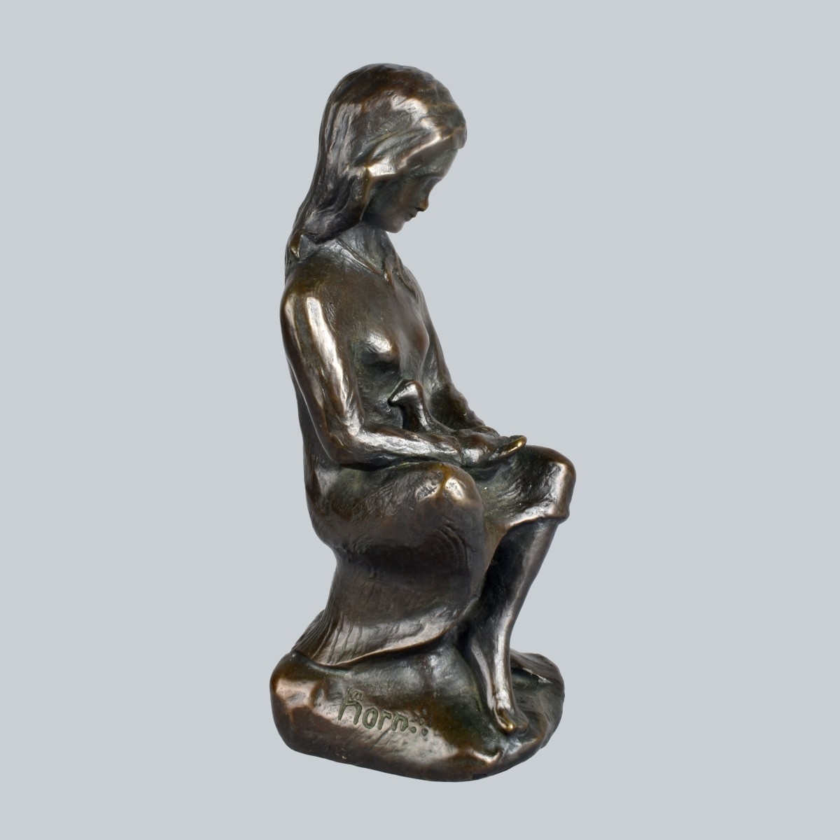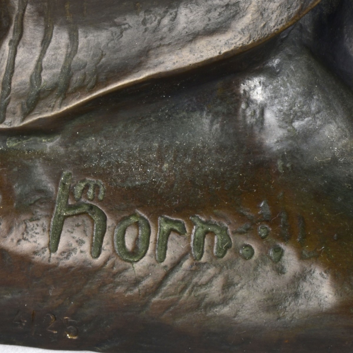 Art Nouveau Bronze Sculpture "Girl with Bird" Signed Horn and Marked Rustica 2000. Overall measures 9-7/8" x 3-1/2" x 4-1/4". Provenance: The Orianne Collins Collection. A large portion of proceeds of this sale will be donated to Ms Collinsí charity of choice, the "Never Give Up Foundation" which fills in the gaps needed to build a more inclusive future for those with disabilities like Spinal Muscular Atrophy. Condition: Good condition. Estimate: $100.00 - $200.00 Domestic Shipping: $75.00