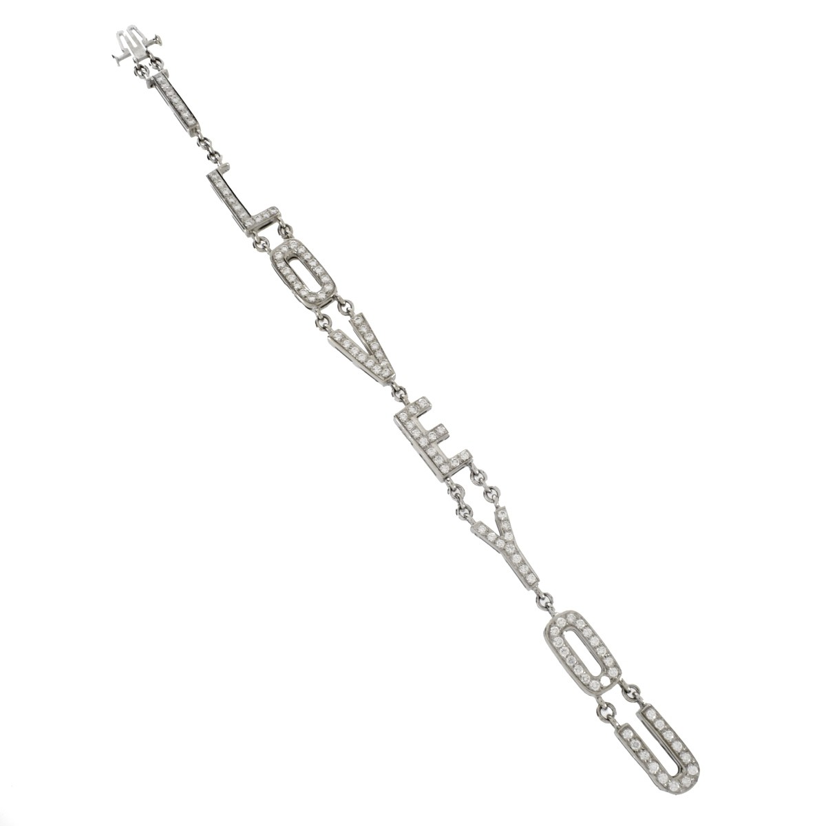 Approx. 3.0 Carat TW Ninety-nine Round Brilliant Cut Diamond and 18 Karat White Gold "LoveYou" Link Bracelet. Diamonds D-E-F color, VVS-VS clarity. Measures 7-1/4" L, 3/8" W. Approx. weight: 28.10 grams. Condition: Very good condition. For additional information and/or WhatsApp video please contact our resident GIA Graduate Gemologist, Russ Kodner at 954.650.5030 Estimate: $3000.00 - $5000.00 Domestic Shipping: $40.00