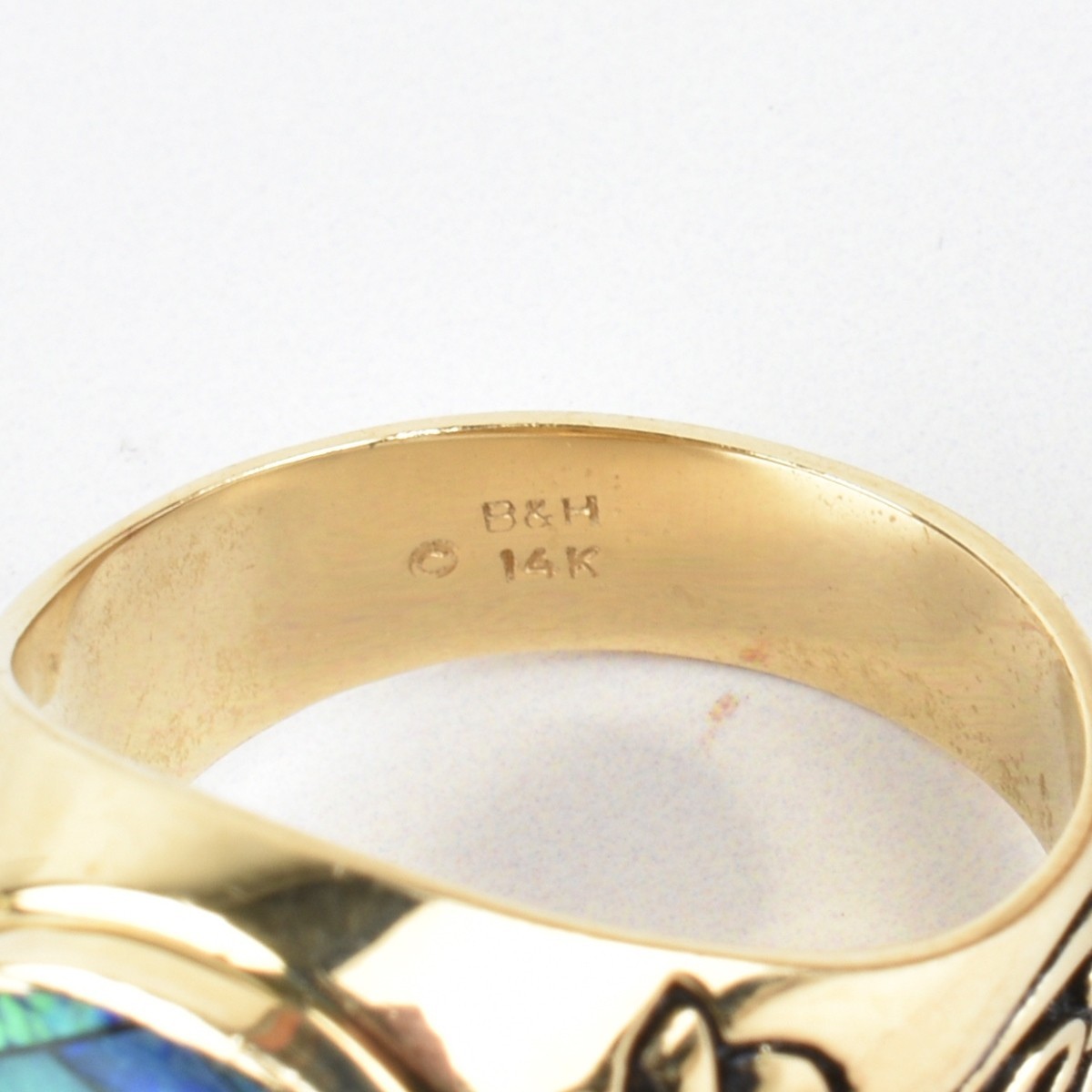 Man's Vintage Black Opal Mosaic Inlaid 14 Karat Yellow Gold Ring. Black opal with good play of multi colors. Stamped 14K. Ring size 10. Approx. weight: 13.70 grams. Condition: As New unused condition. Estimate: $1000.00 - $1500.00 Domestic Shipping: $40.00
