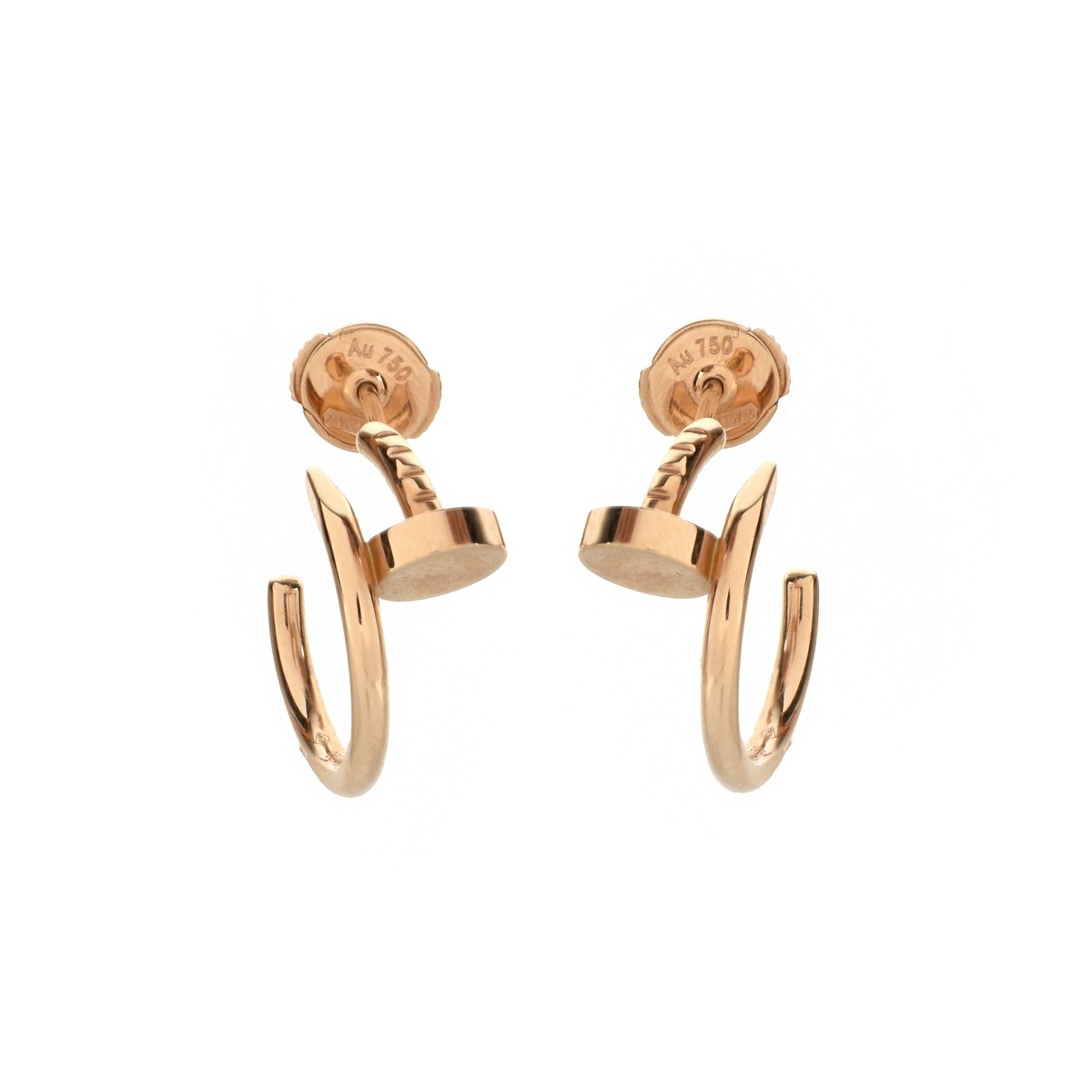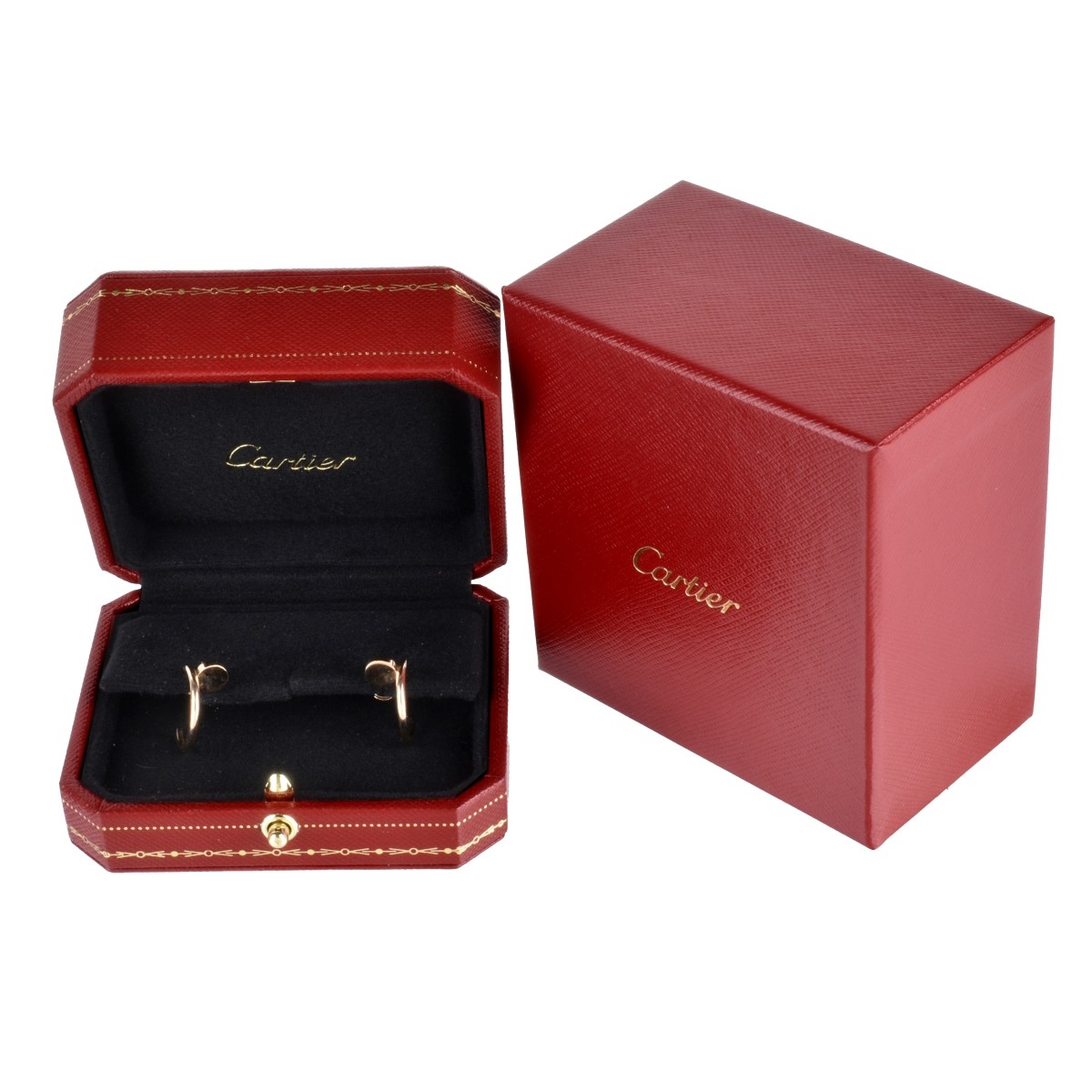 Cartier Juste un Clou 18 Karat Pink Gold Hoop Earrings. Signed, stamped 750. Measure 11/16" L Approx. total weight: 5.17 grams. With box and papers Condition: Very good condition. For additional information and/or WhatsApp video please contact our resident GIA Graduate Gemologist, Russ Kodner at 954.650.5030 Estimate: $2000.00 - $3000.00 Domestic Shipping: $40.00
